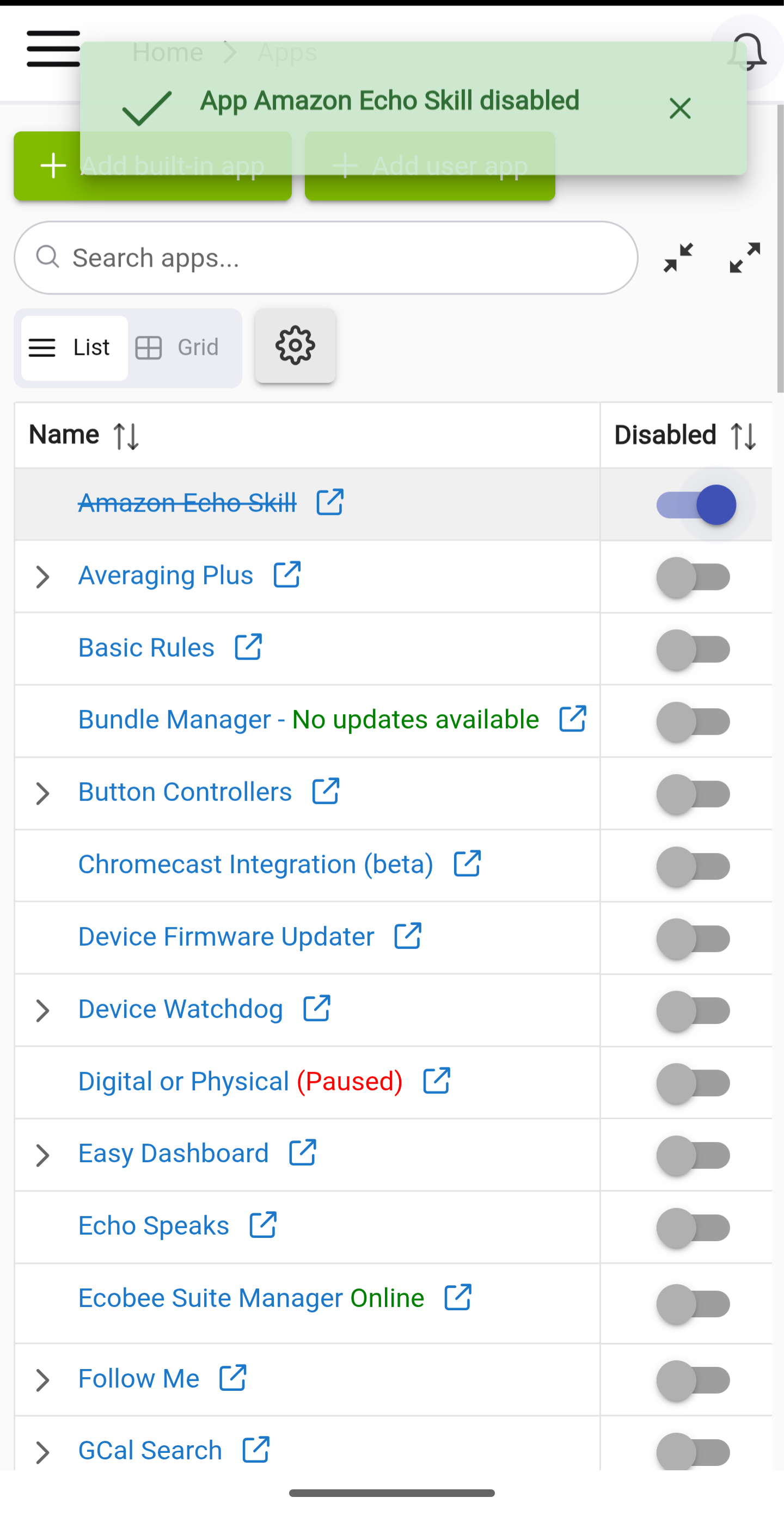 I also now notice that if I touch the slider to disable one of the apps - where that slider shows up on the right-most column - after the green disable pop-up acknowledges the action the whole column disappears: