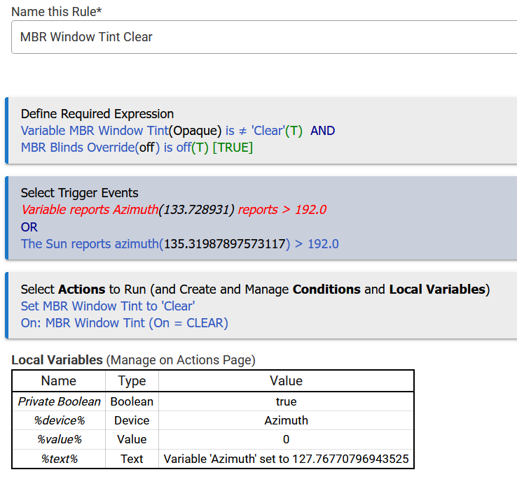 I have 2 rules triggered by a custom attribute (sun azimuth) and they are triggering opposite the designated comparison. I altered one to check and the result is repeatable.