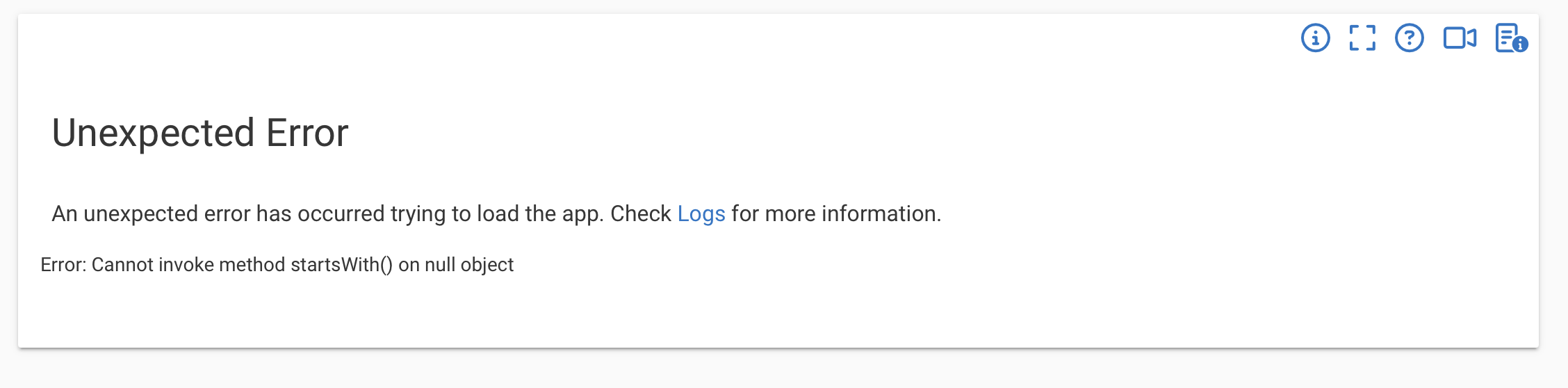 I have a rule that has a condition in the required expression “Not between Date/Time X and Date/Time Y” and that condition references 2 local variables for the Dates/Times. The rule was working fine, but when I clicked into one of the local variables to update it, I received the error “Error: Cannot invoke method startsWith() on null object” (screenshots below). The local local variable did have a past date/time in it, but that hasn’t been an issue in the past. Now I can’t access the rule at all. This issue looks similar to the issue at the following link: Any help fixing this would be appreciated.