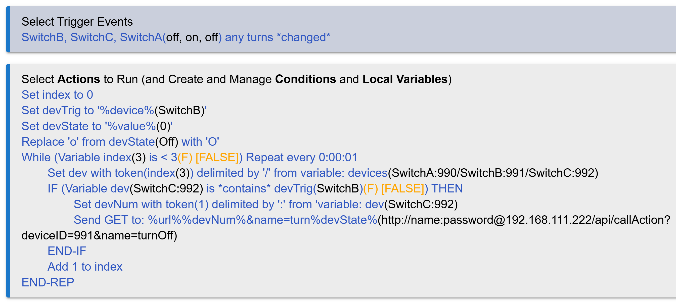 I am using Rule Machine to sync status between HE and Z-Box. I am doing this via 26 variables. However, because there is no Do Case, I have to make 52 If Thens -- Off and On for 26 variables. There has to be a better way.