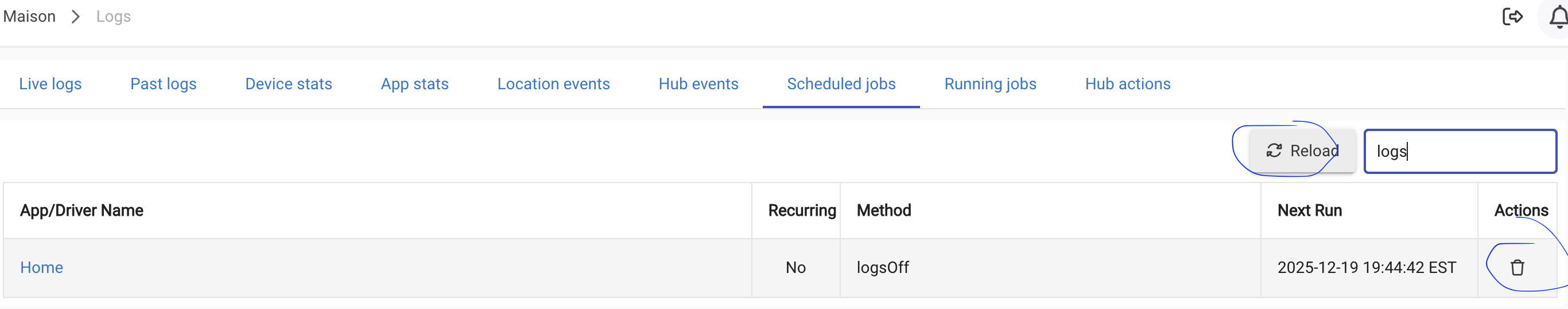 While from the hub logs page, scheduled jobs, events and logs can be reloaded (and scheduled jobs deleted), the situation for device details is different: events and logs can be reloaded, but not scheduled jobs, and scheduled jobs can't be deleted.