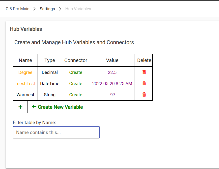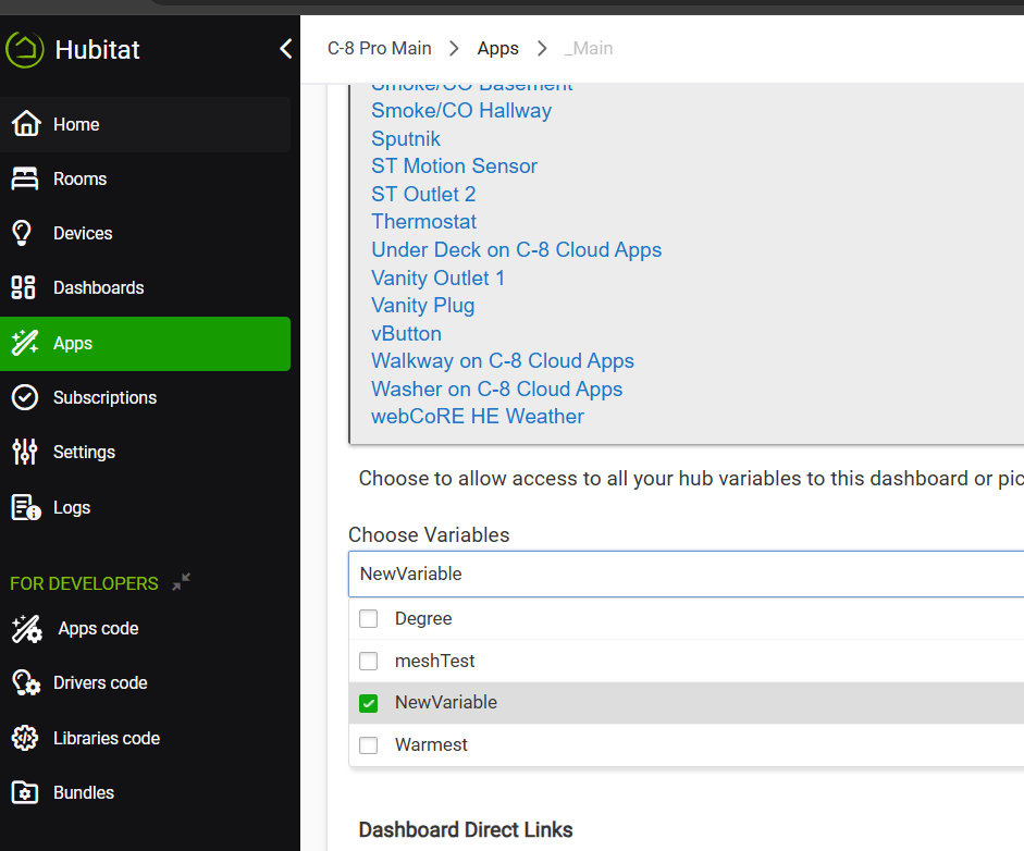 C-8 Pro running 2.4.2.160. Nothing new – I’m confused - again. I thought just a little while back the name of the game was to not use connectors for hub variables. So I redid my dashboards to use the global variables directly and deleted all the connectors. All my dashboards work fine that way except now I wanted to add a new global variable to a dashboard - and I now can’t find a way to do that – except by making a connector to be a device which then can be added. It appears that ONLY devices can be added to a dashboard, not variables. What happened to being able to add global variables as well as devices to a legacy dashboard? Is bringing back connectors really the way to go now?
