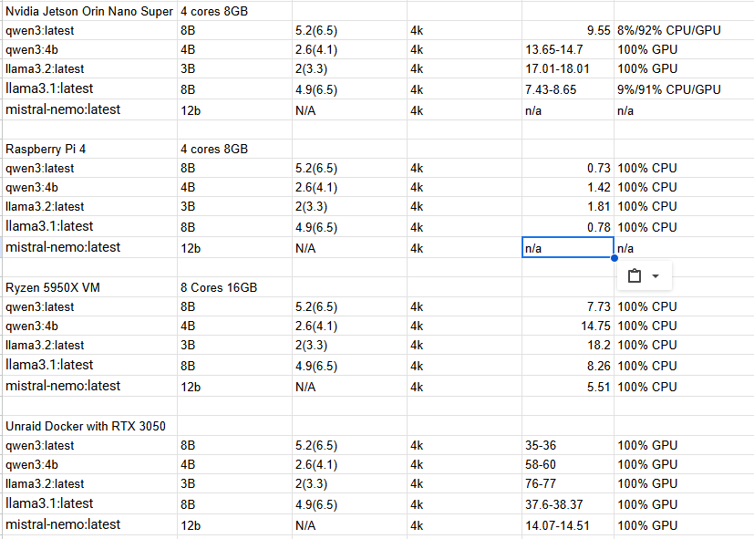 The results have been a little interesting. I needed some base lines to compare to. So I also got values from a Pi4 and my Home server running CPU only from a VM. I am also collected the results from my RTX 3050. Basically I just loaded a given LLM then started by saying "Hi" to it to fully initialize it and then asked it to "tell a story" a few times.