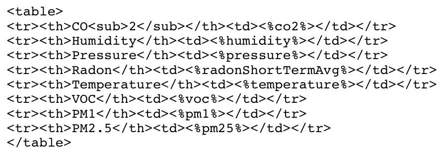For some reason, the PM1 and PM2.5 aren’t showing up in my HTML template. Maybe I didn’t set it up right? I can’t seem to see what I did wrong though…