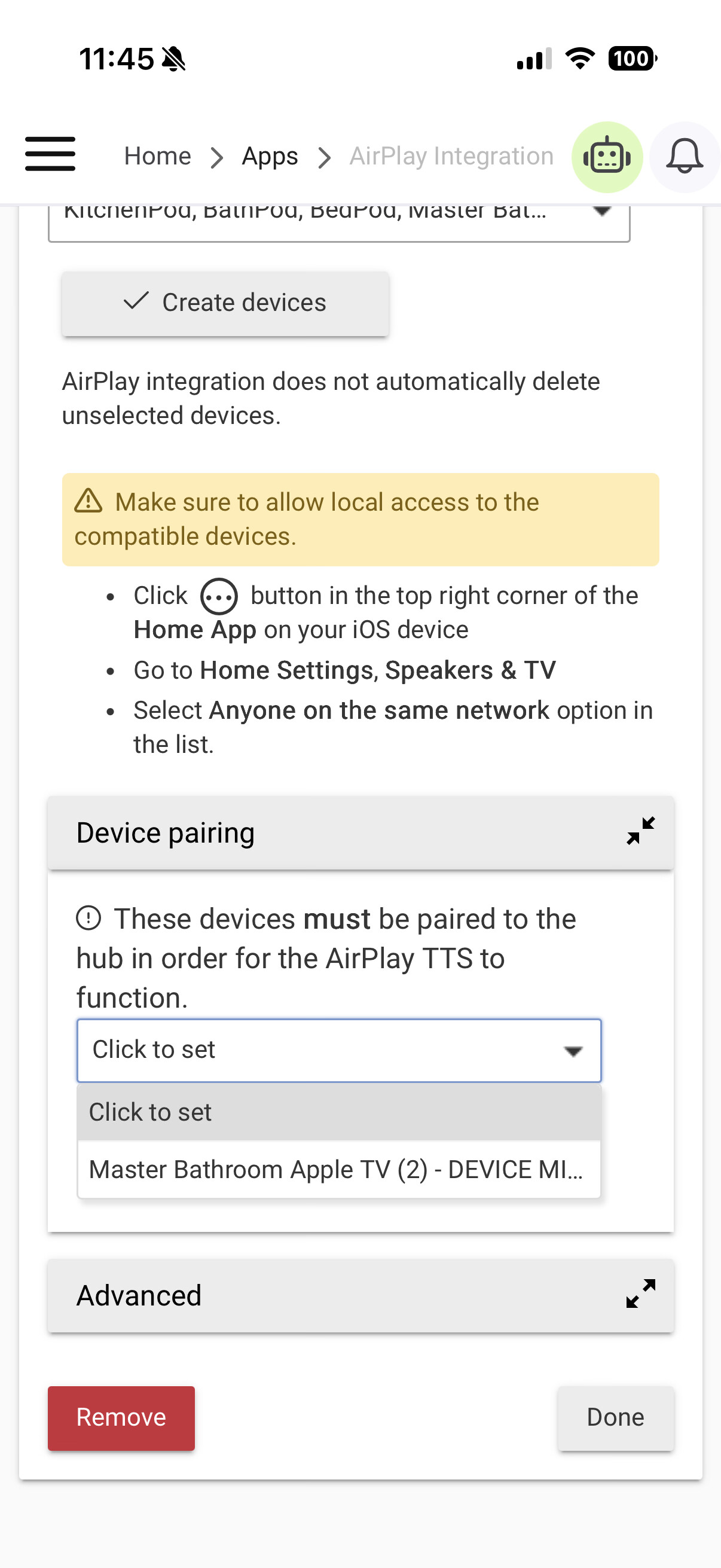 @gopher.ny , Iām not selling anywhere to enter the airplay code, as you can see in the screenshot. Iām not using the integration, so I deleted it, rebooted the hub, and reinstalled; same situation. My Apple TVs and HomePods all show up. HPMs work, ATVs popup with a pairing code when I try sending a test text, but there is nowhere to enter the code.