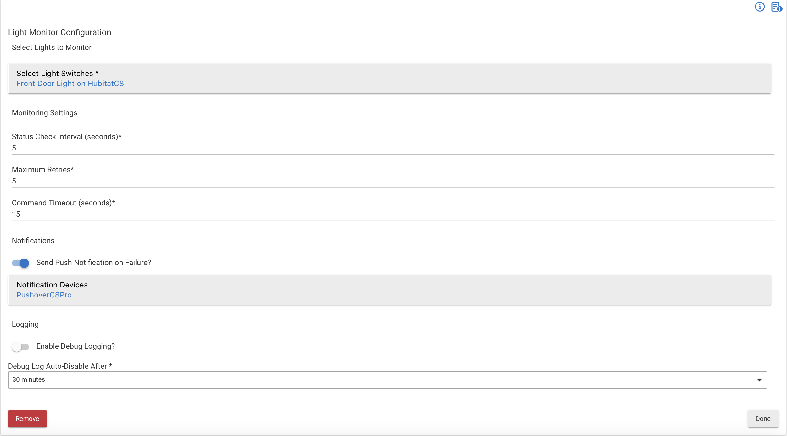 logInfo("MONITORING COMPLETED - Light ${deviceName} successfully changed to ${desiredState} after ${elapsedTime.toInteger()} seconds and ${monitorData.checkCount} retries")