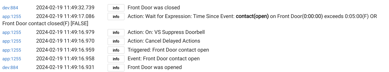 To summarize my issue again, the rule is waiting for one of two things to happen... the front door closes or 5 minutes elapses since it was opened. The front door closes about 15 seconds after this wait begins, but the rule doesn't proceed at that point nor does it proceed after 5 minutes.