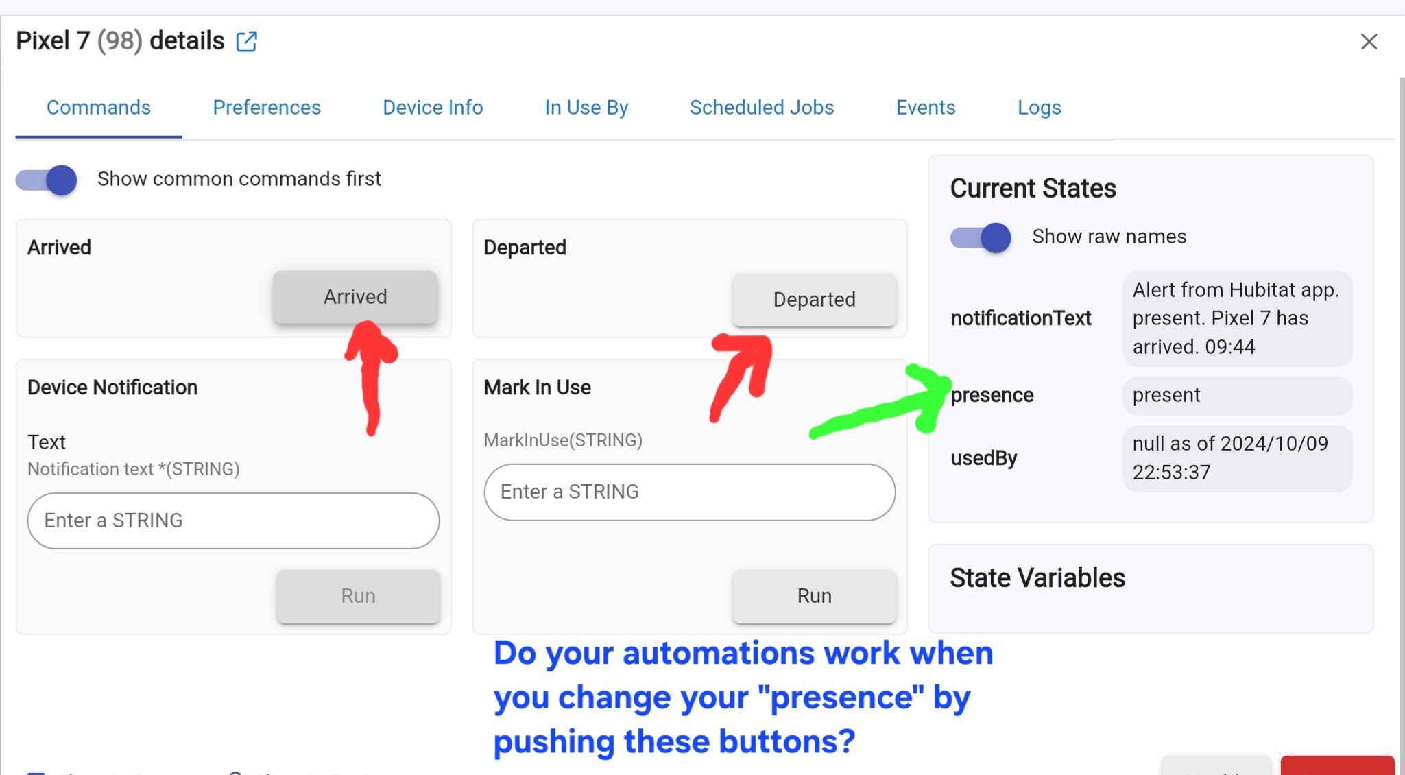 I just went and rechecked what was in ur picture and where the green arrow is did change when I hit departed and when I hit arrived when I hit arrived manually the automations work