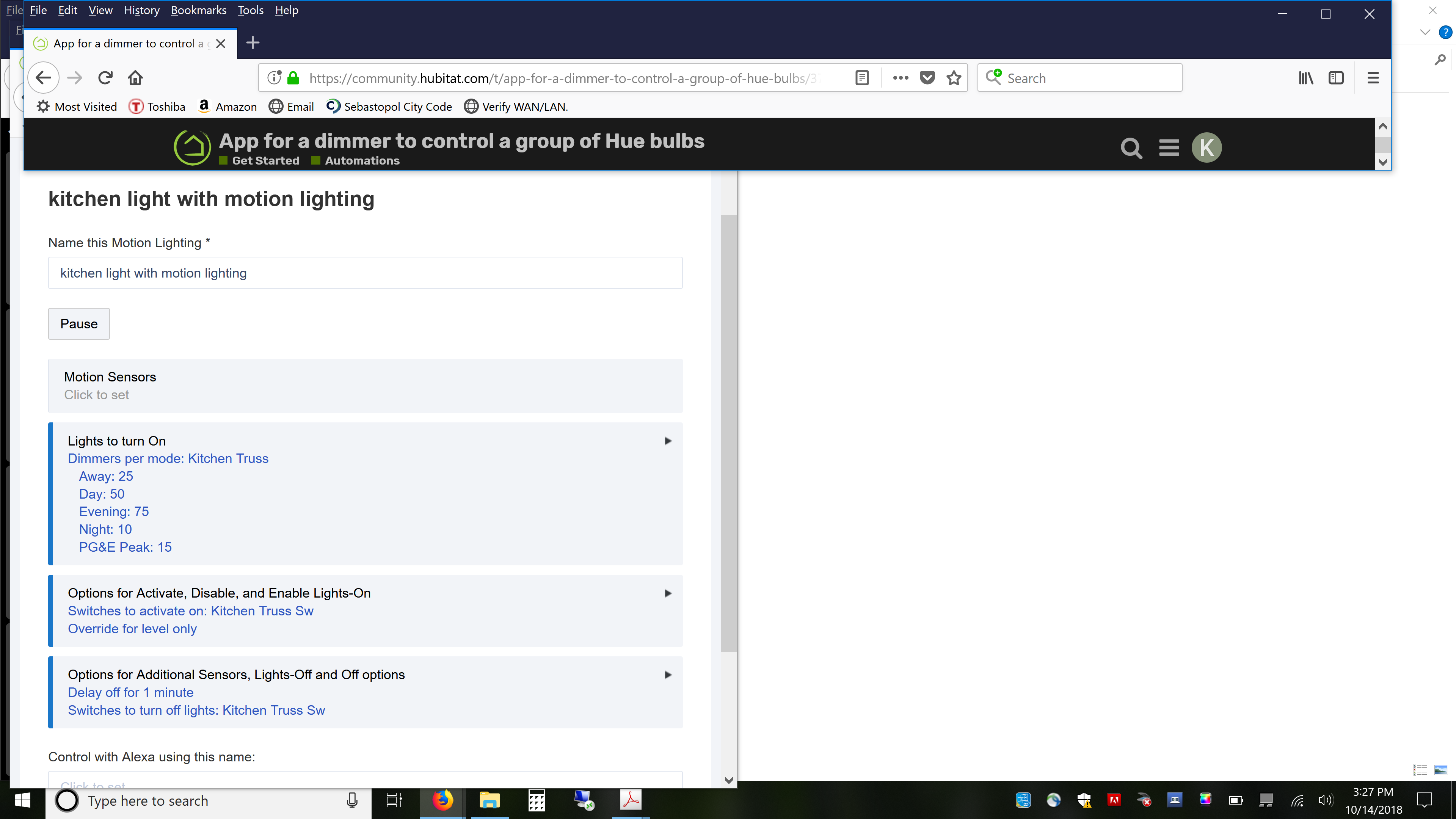 Thanks. I got the light set up as follows, and the on/off works, turning the light on at the % specified. (in combination with the other rule to change the dimming level). Follow up questions: - is there a way to 1) get the on/off rule I just made to just turn on at the previously set dimmer level (as opposed to the set percentages in the motion lighting)? often that is preferred to me - if, as a user, I find a nice level for how sunny or cloudy the week is, it's nice to have that particular level 'stay' as the light level for that week or so, without having to go into 'coder' mode. Or 2) combine the off/on with the dimming tracking previously created (also trying to get to the same ideal, thinking if it were possible to combine into rules - it would help with the first question/ideal of remembering whatever light level was last set).