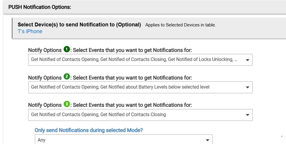 --Get push notifications of locks and contacts actions, per device, 3 Options.