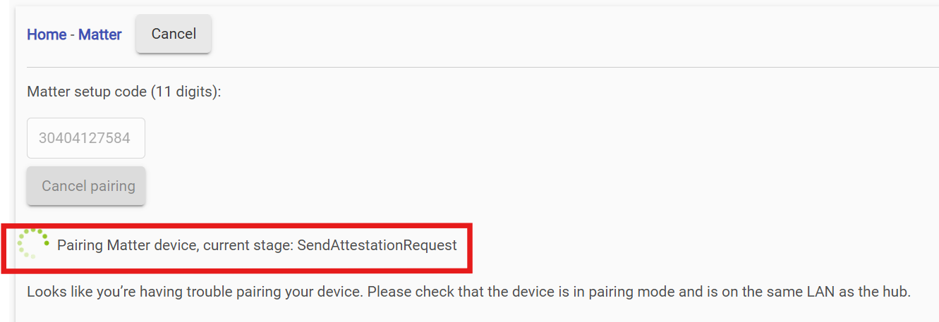 I let it sit at the above screen for about 10 minutes with no changes noted nor anything in the Hub's Logs. I was able to pair it with Home Assistant with no issues afterwards.
