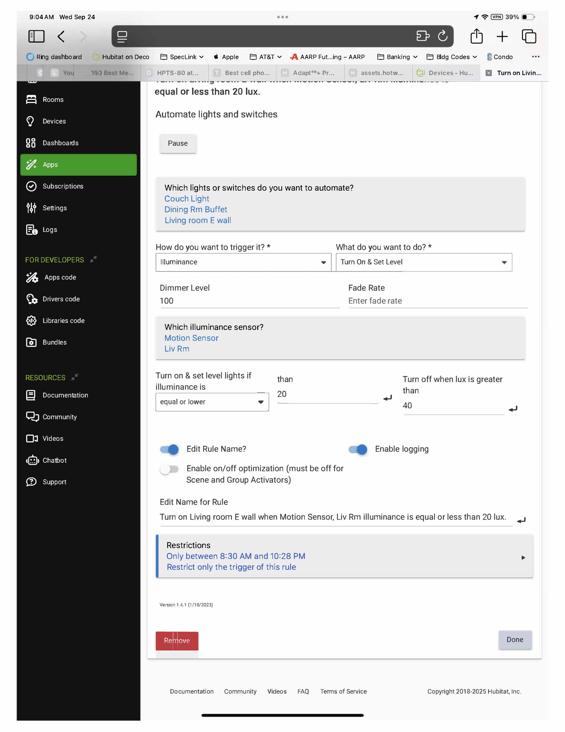 I have a Zoom Q Sensor ZSE11. Ive written a simple automation rule 1.2 to switch on lights when the lux is equal or lower than 20 and to turn them off when the lux is greater than 40. It is restricted to trigger between 8:30am and 10:28pm every day. The app appeared to work yesterday but not today. The lux is reported as 5 which should have triggered the lights.