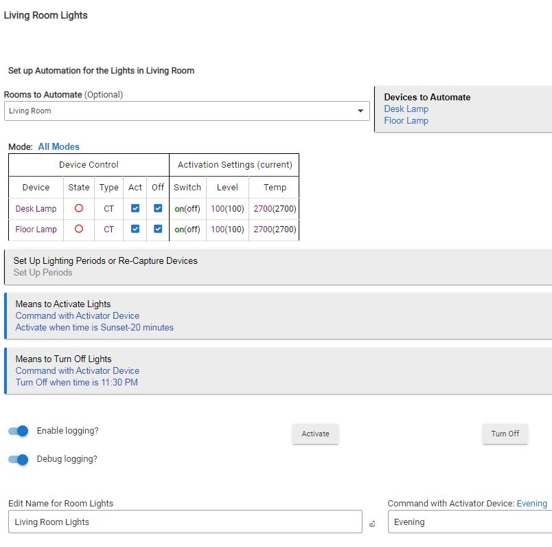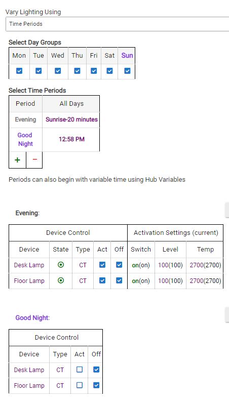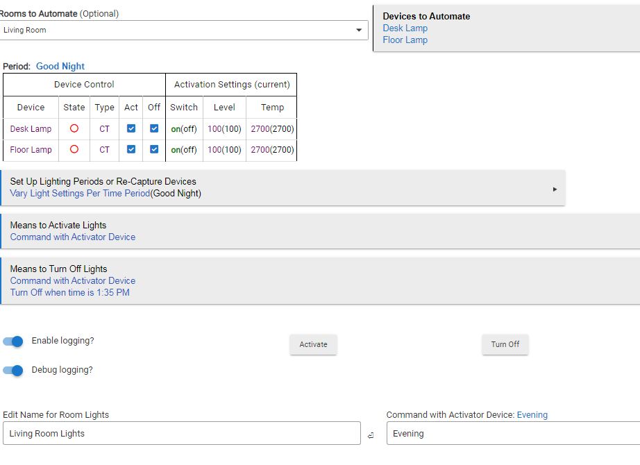 I set the Good Night period for testing and it appears from the log that it triggered. I had previously manually set both lamps on, however they did not turn off even the the ACT column unchecked.