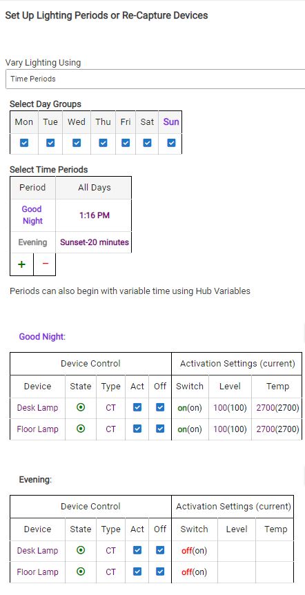 In the attempts to set the "Vary Lighting Using" "Time Periods" options under the "Modes" was apparently not the correct approach for setting time periods as I was attempting. After clearing the Modes and setting time periods on the main page of the automation in the "Means to Activate" and "Means to Turn Off" I got the results I was expecting. The last piece was to expose the automation to Alexa which also works now with the commands "Turn on Evening" and "Turn off Evening" as it was on my previous hub.