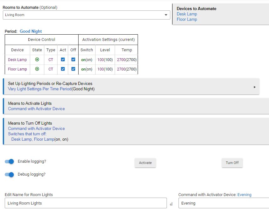 I set another time period called Good Night that I intended to be an automation to turn off both bulbs.