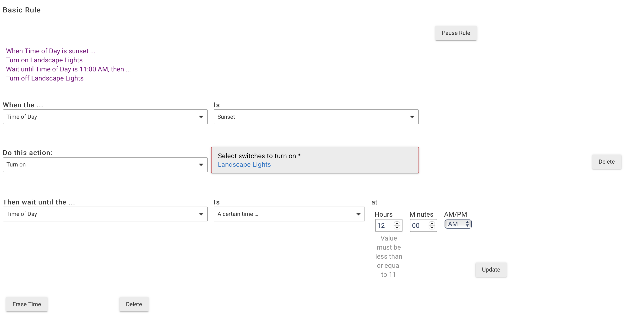 I'm trying to set up a new basic rule to turn on at sunset and off at midnight. The time picker for setting midnight has an error that says the hour must be 11 or less.
