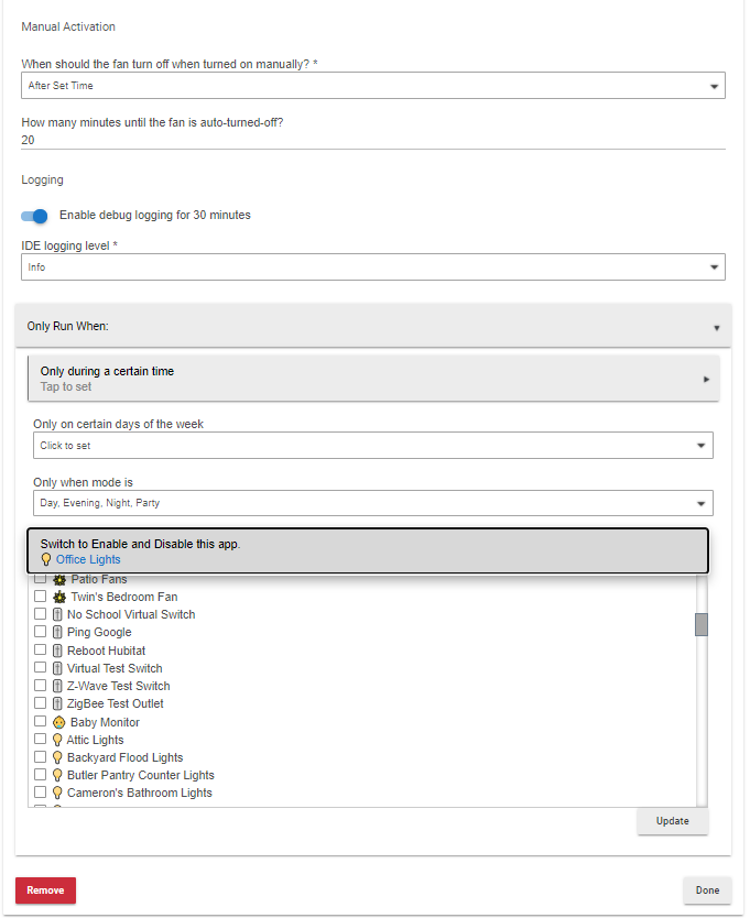 Well, I couldn't sleep again so I went and reworked some things. The biggest change is probably modes. Also added only on days of the week and only during a certain time. Last but not least is switch to disable. Changes posted to Github and HPM.