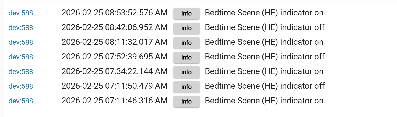 However, I noticed that when all devices once again match the defined state of the scene, the system automatically recognizes the scene as active. This appears to be what is generating the periodic on/off log entries.