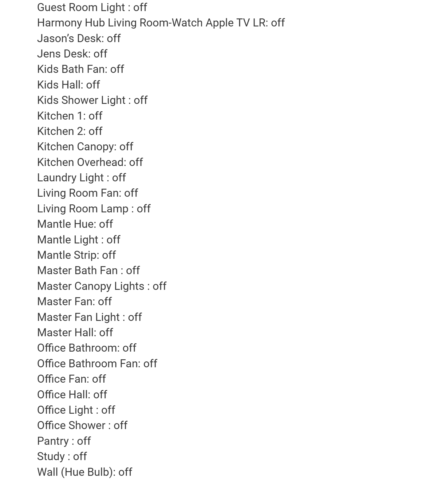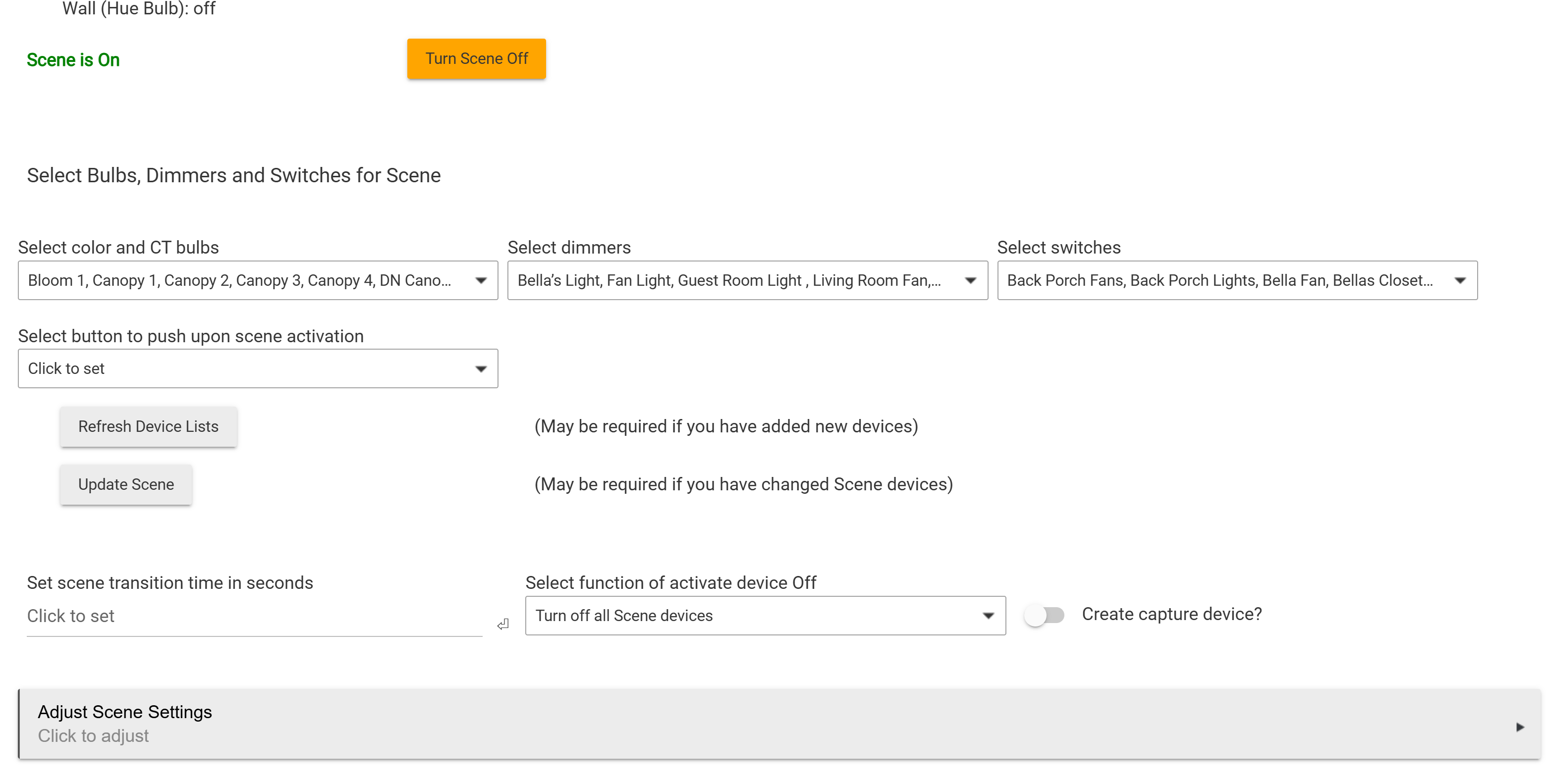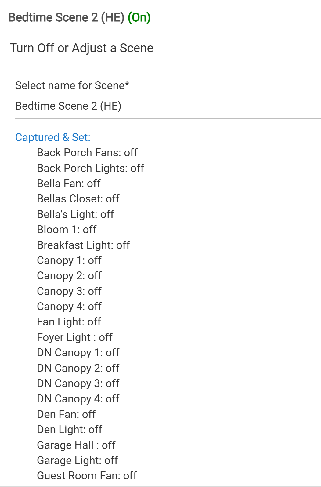 Previously, when a scene was activated (for example, “Bedtime Scene”), it would set all devices to the defined desired state. In this case, it turns off all the lights in the house.
