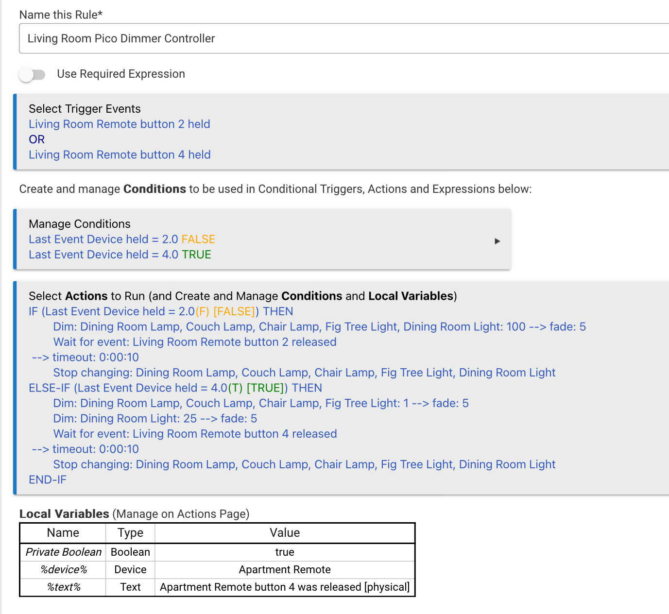 - You could have an undesirable affect by combining multiple bulbs as I have done here, because if the bulbs are at drastically different levels, the fade will be much slower on the ones that are closer to the target level. You could fix this by recording the level of each bulb at the time of trigger in local variables, calculating the fade duration based on the difference between the current and desired level, and store that in another variable to be applied to individual dim commands for each bulb. This hasn’t resulted in any noticeably weird dimming behavior for me, so I didn’t bother building this in (but if I do for lolz, I’ll post the logic).