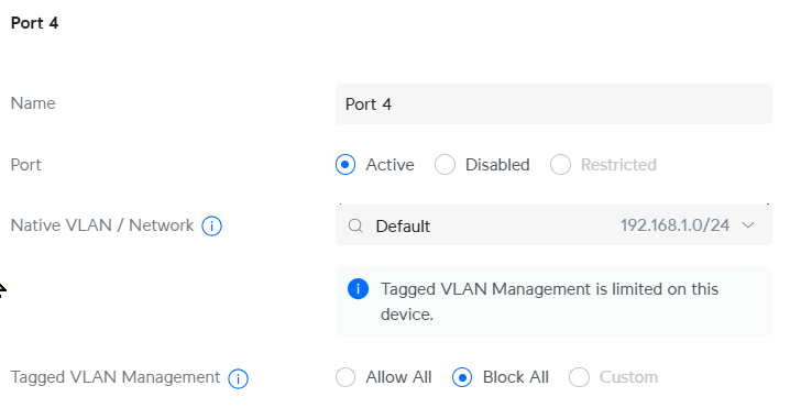 After selecting a VLAN only "Block All" permitted: