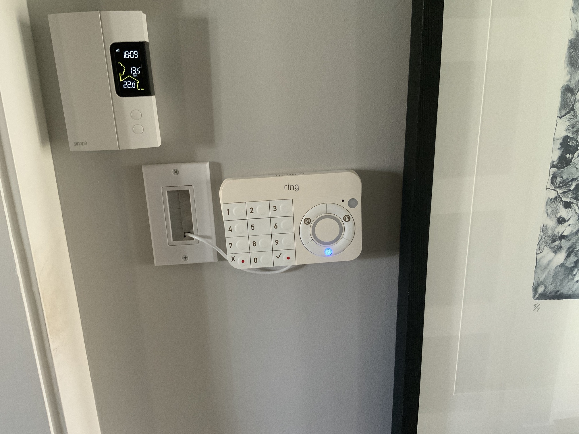 Looking at your picture your challenge is those sensors require low voltage. If it were me I would make a small hole behind the sensor and run the low voltage cable into it and then put one of these in same stud cavity below. Then use the nearby outlet below to plug the brick into. In other words the low voltage wire will be behind drywall and wire comes out at the bottom near the outlets. I’ve seen these at local box stores too. https://www.amazon.com/VCELINK-Mounted-Attachment-Mounting-Brackets/dp/B0BZD7XXX1