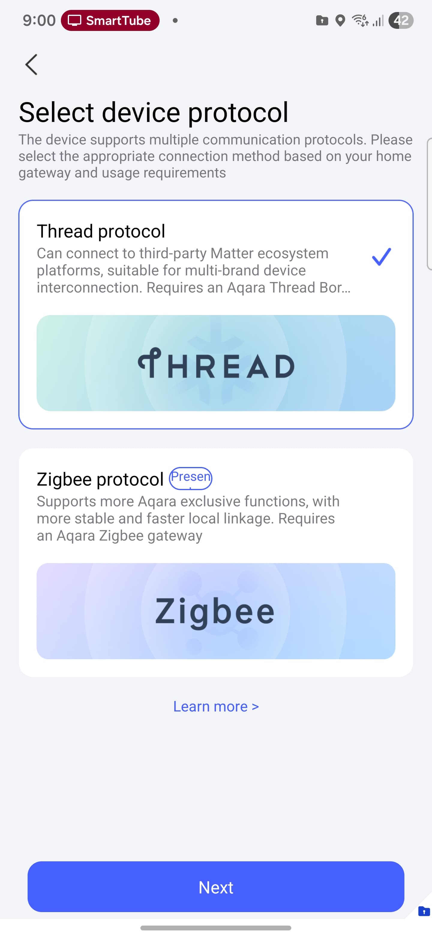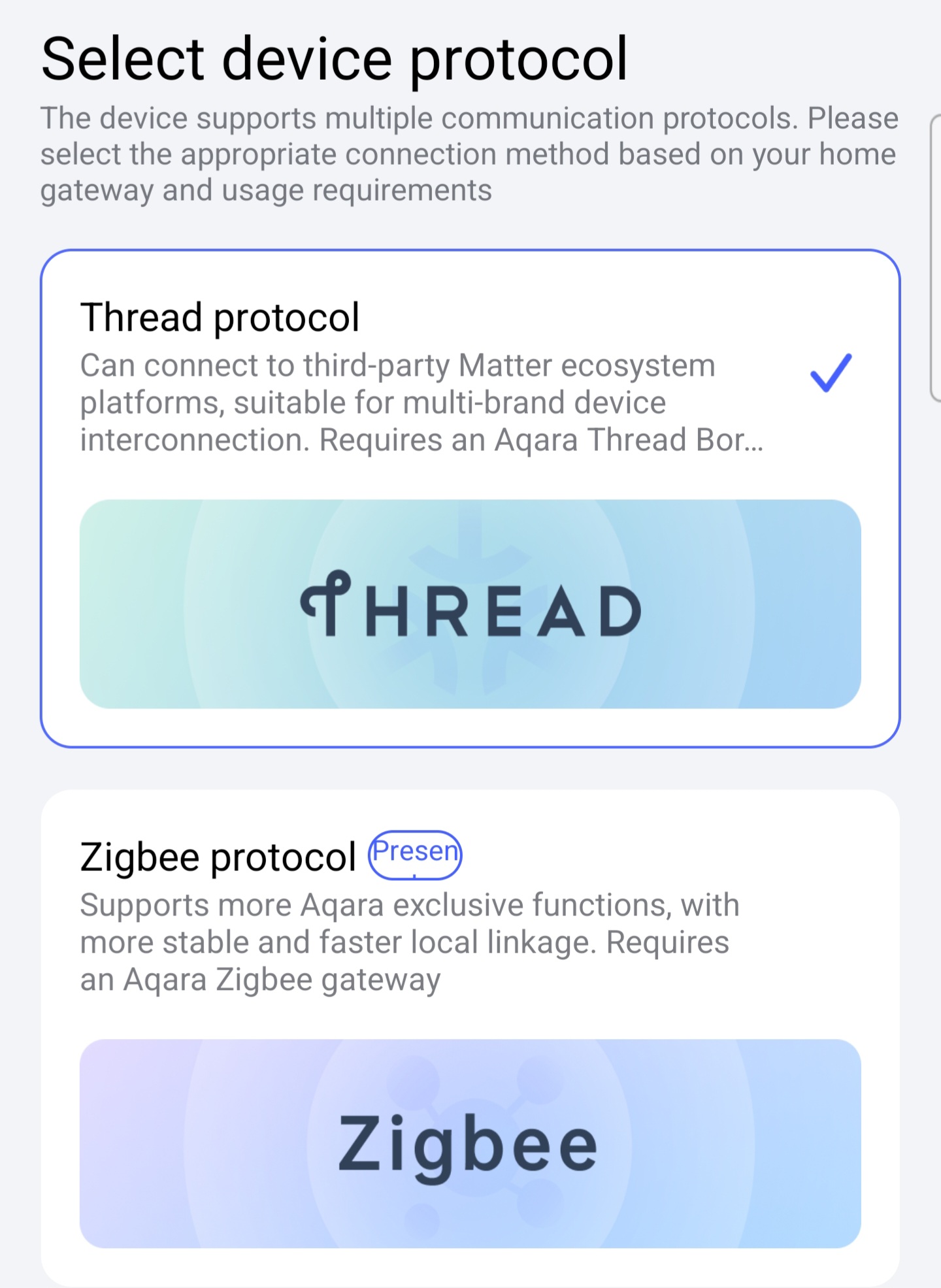 Once the device is in pairing mode, you can select either Thread or Zigbee protocol.