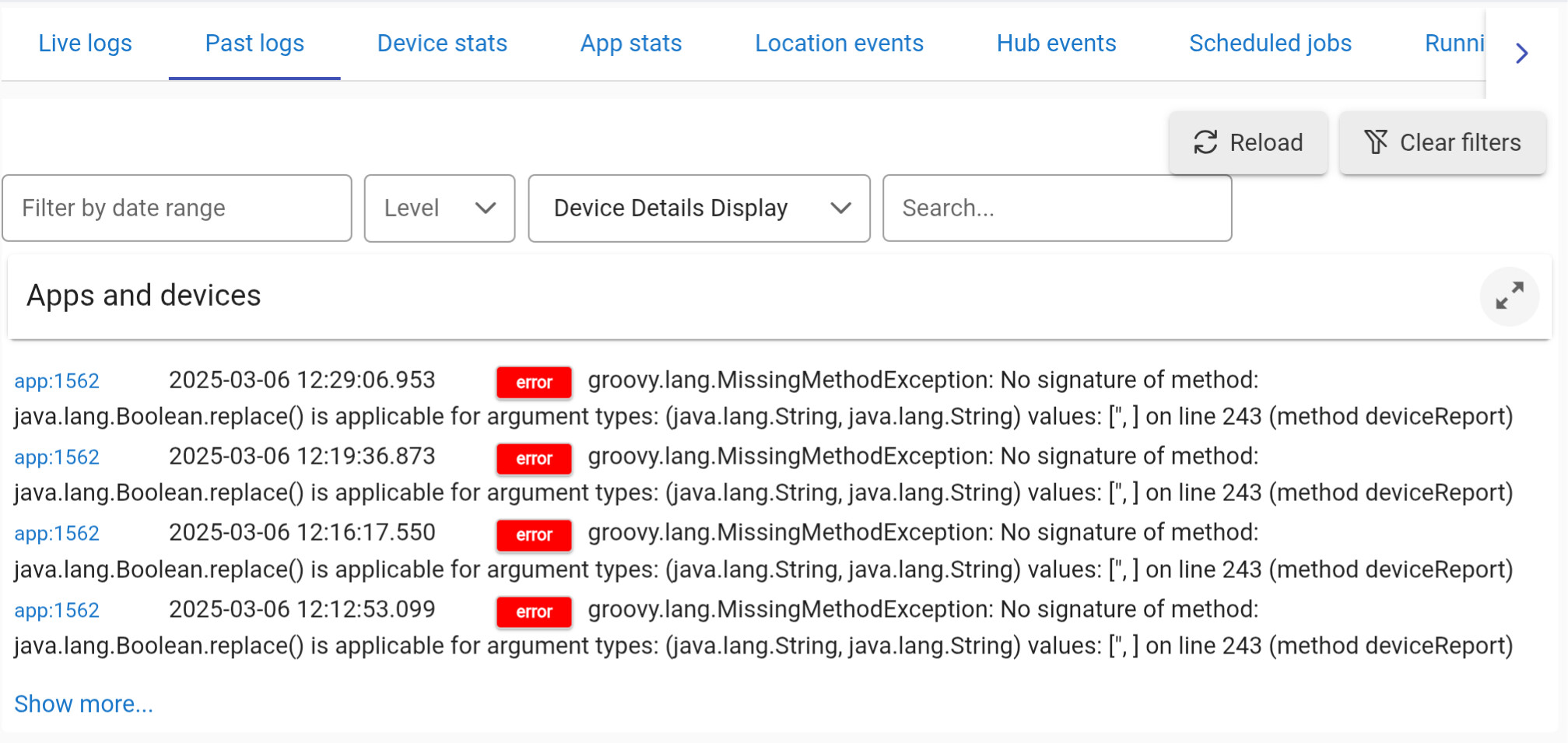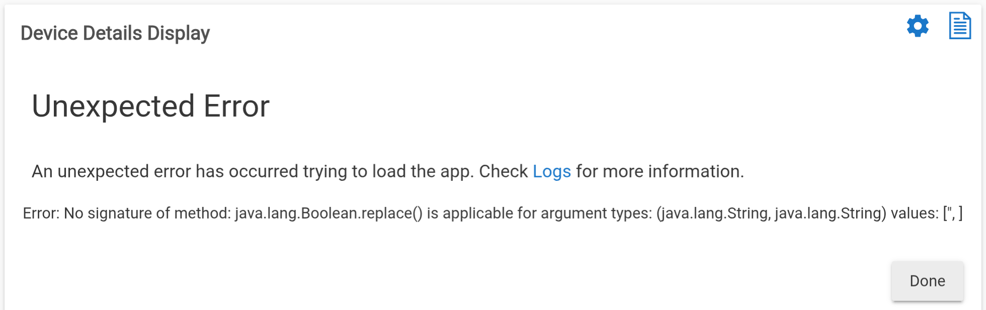 Oh I think I see.... its going through the device data, and assuming they are all strings. May need to add a check in there to verify the data type before attempting the replace. You must have some devices with true/false values in the device data, which is odd I have never seen anyone do that before.
