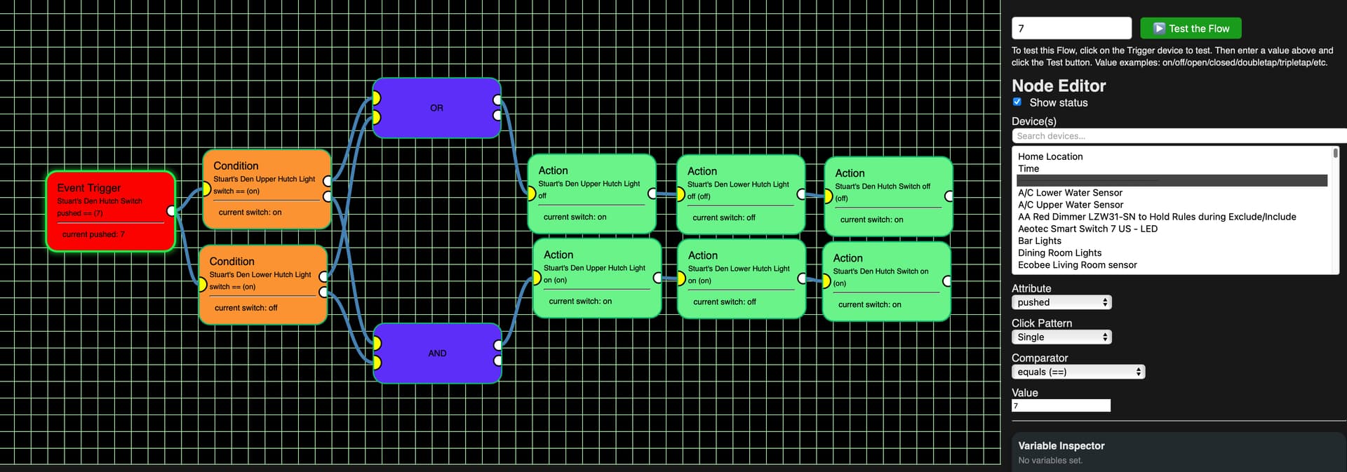 As to sizing tiles based on the number of devices in a tile I'm not sure how to select multiple devices per tile. For example, in the screenshot at the very bottom below I am trying to have it say that if I push button 7 of my Den Hutch Switch and either the Upper hutch light or the Lower hutch light is on I want to turn the Upper hutch light, the Lower hutch light and the Den Hutch Switch off. I did this in 3 tiles. Otherwise (i.e. both the Upper and Lower hutch lights are off) I want them both on as well as Stuart's Den Hutch Switch. Could I have put all 3 actions into an 1 action tile and say to turn them all off or on? If so, how? If not, I'm not really sure what you mean by having more than one device per tile.