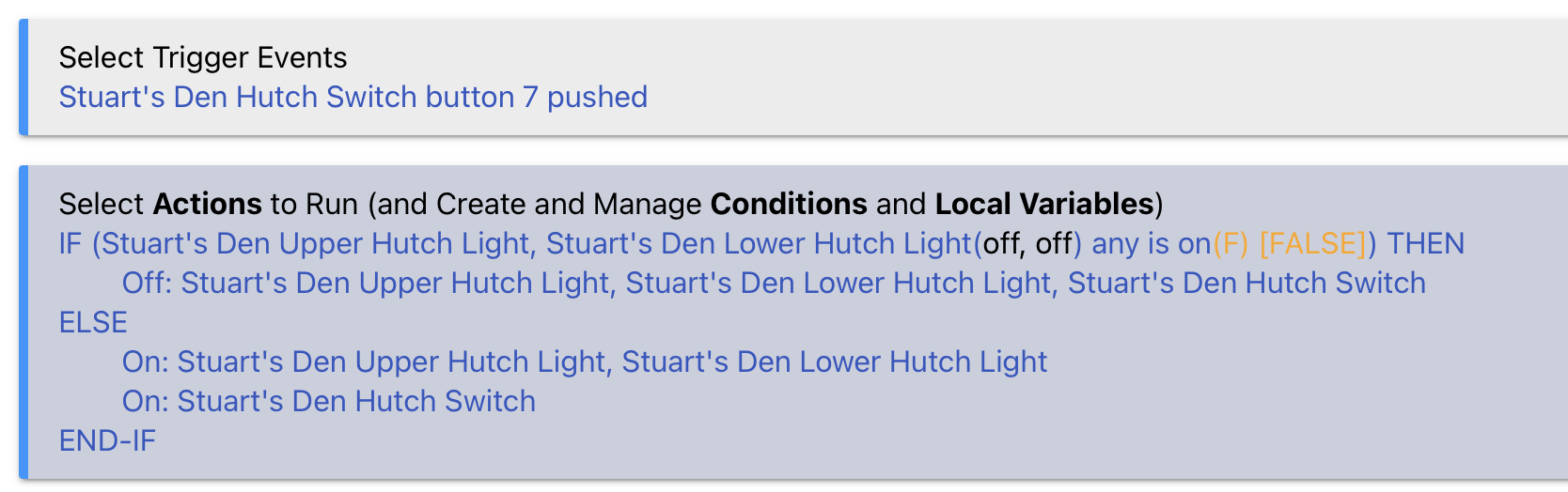At the AND if they were both true (i.e. that both the Upper and Lower Hutch lights were off) then the Upper Hutch Light, Lower Hutch Light and the Hutch Switch would all be turned on.