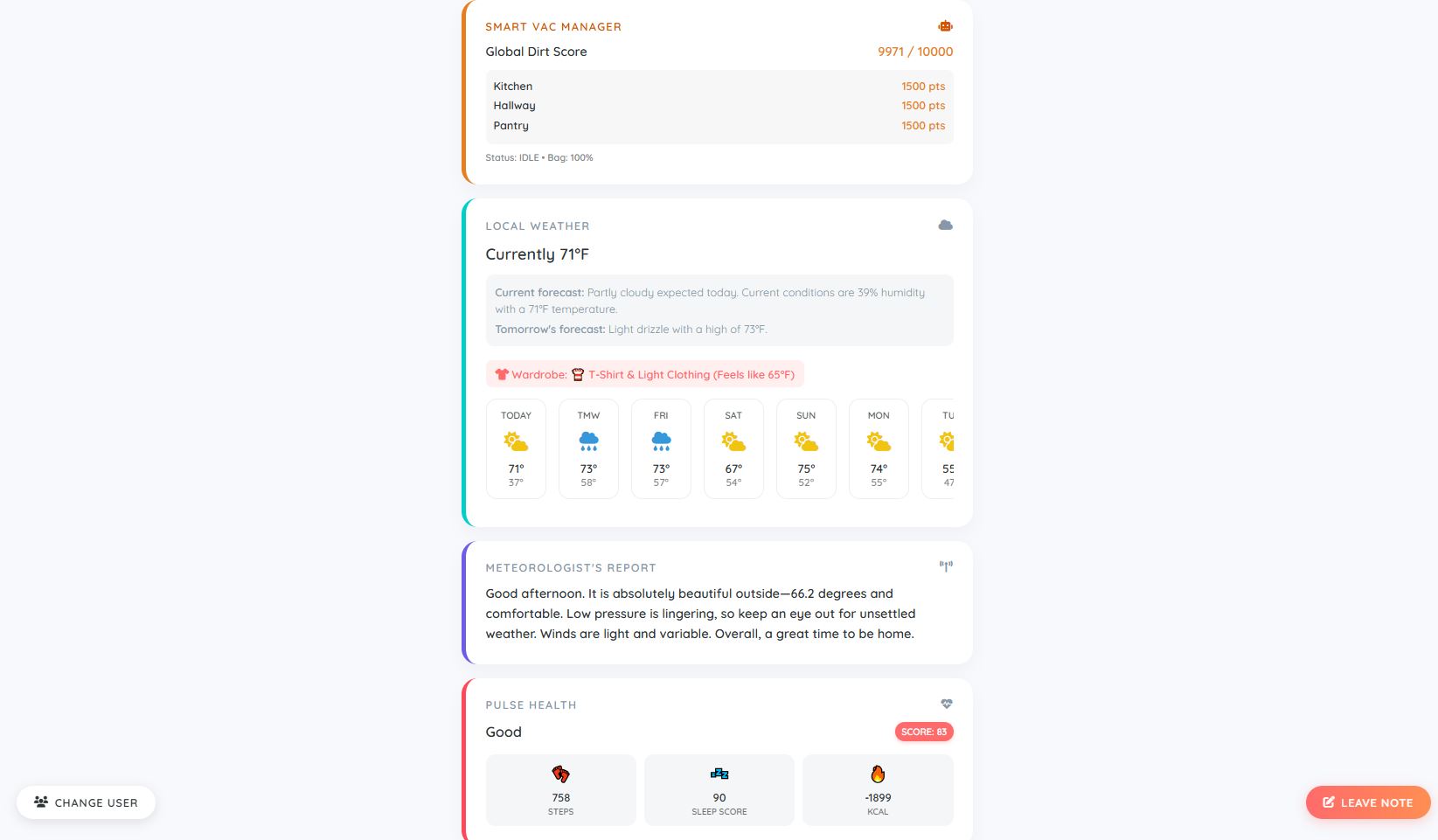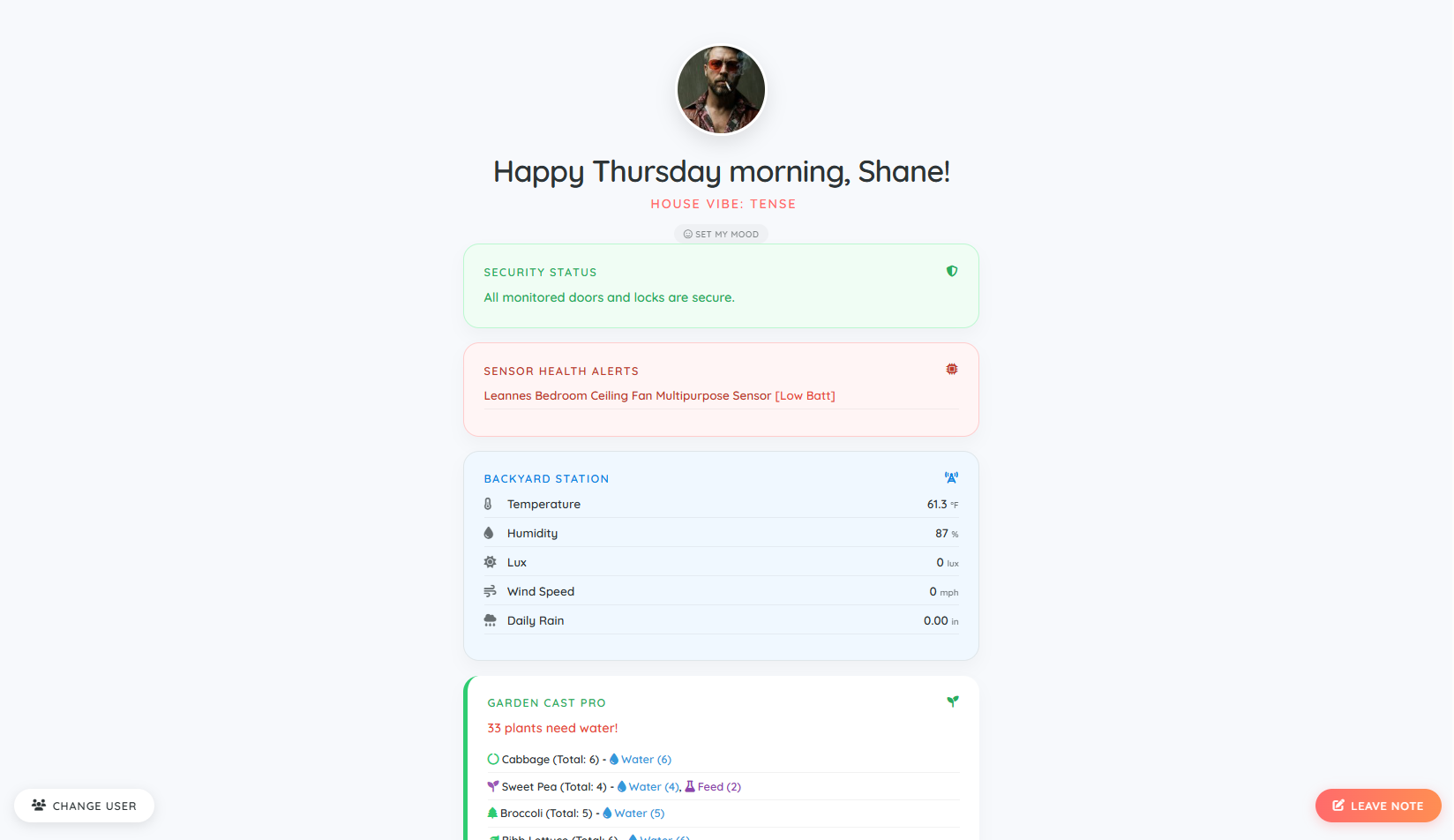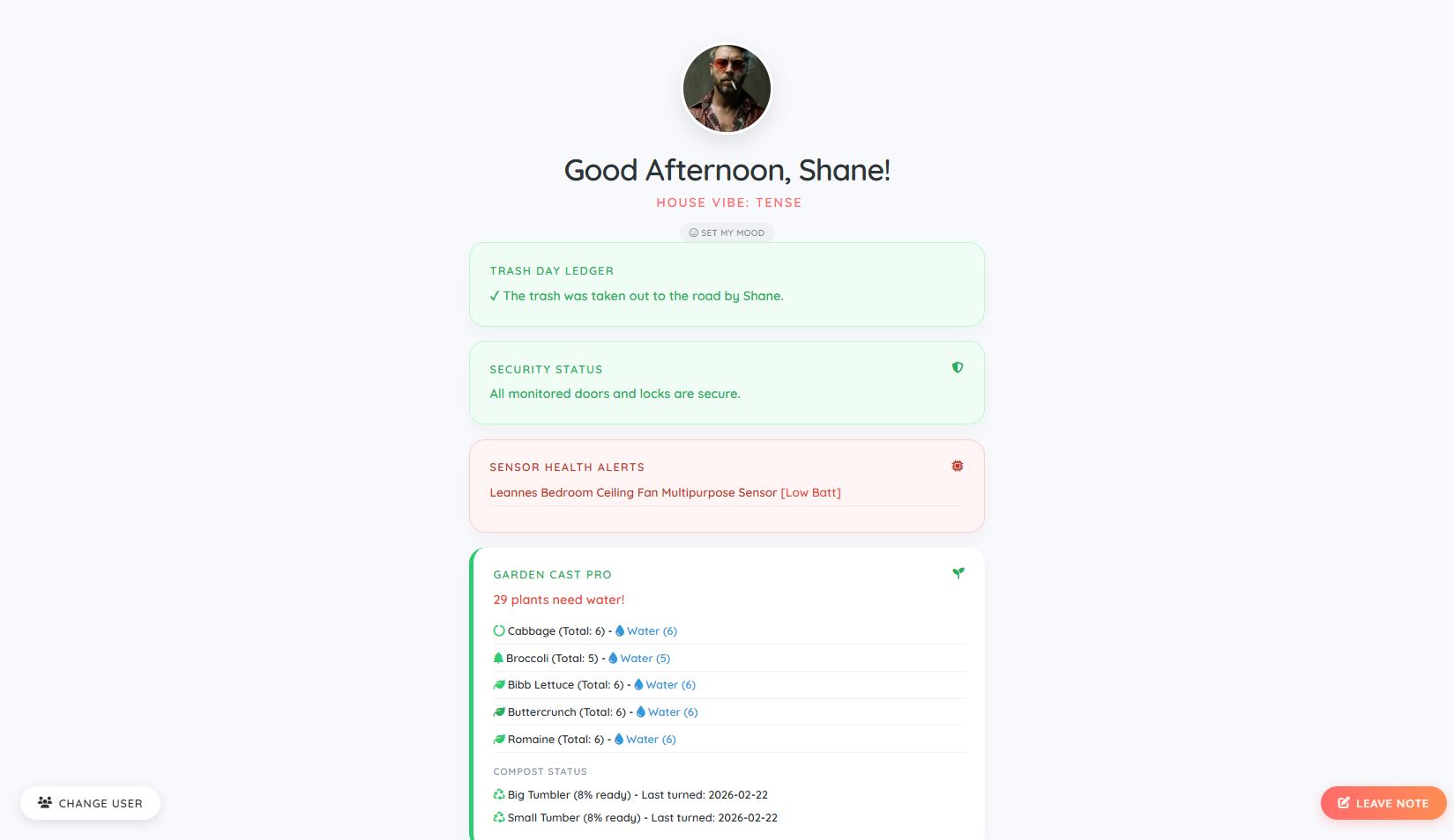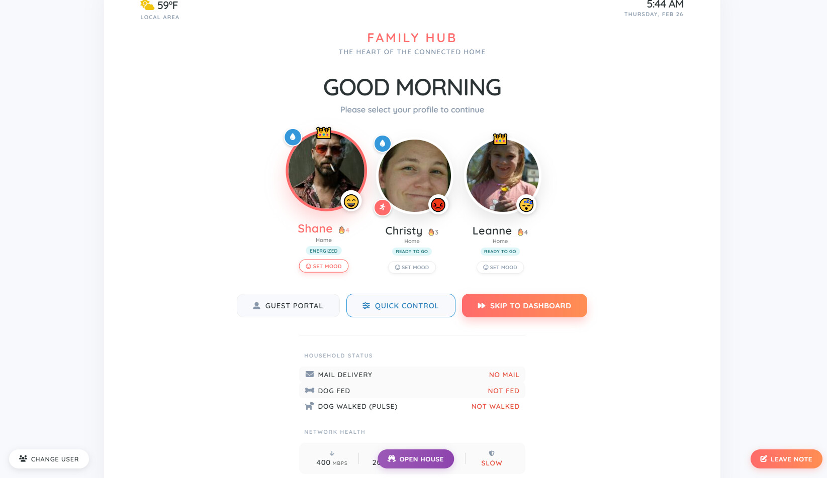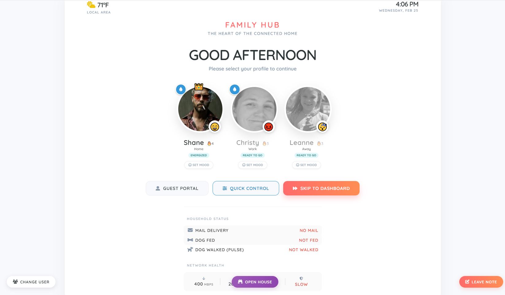 House Vibe & Moods: Tracks selected users' moods (Happy, Sad, Electric, Gloomy, etc.) to calculate and display an overall "House Vibe" on the dashboard . Includes a popup modal for users to check in and update their location and mood.