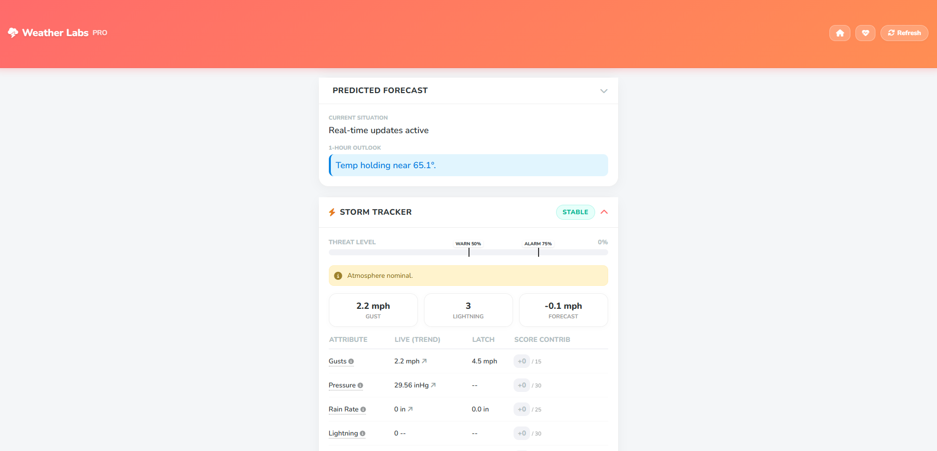 Weather Labs & Rain Warden: Predicts surges for storm, flood, and freeze risks, alongside immediate heavy rain and sprinkling detection. Displays data from outside air stations including wind speed and gusts.