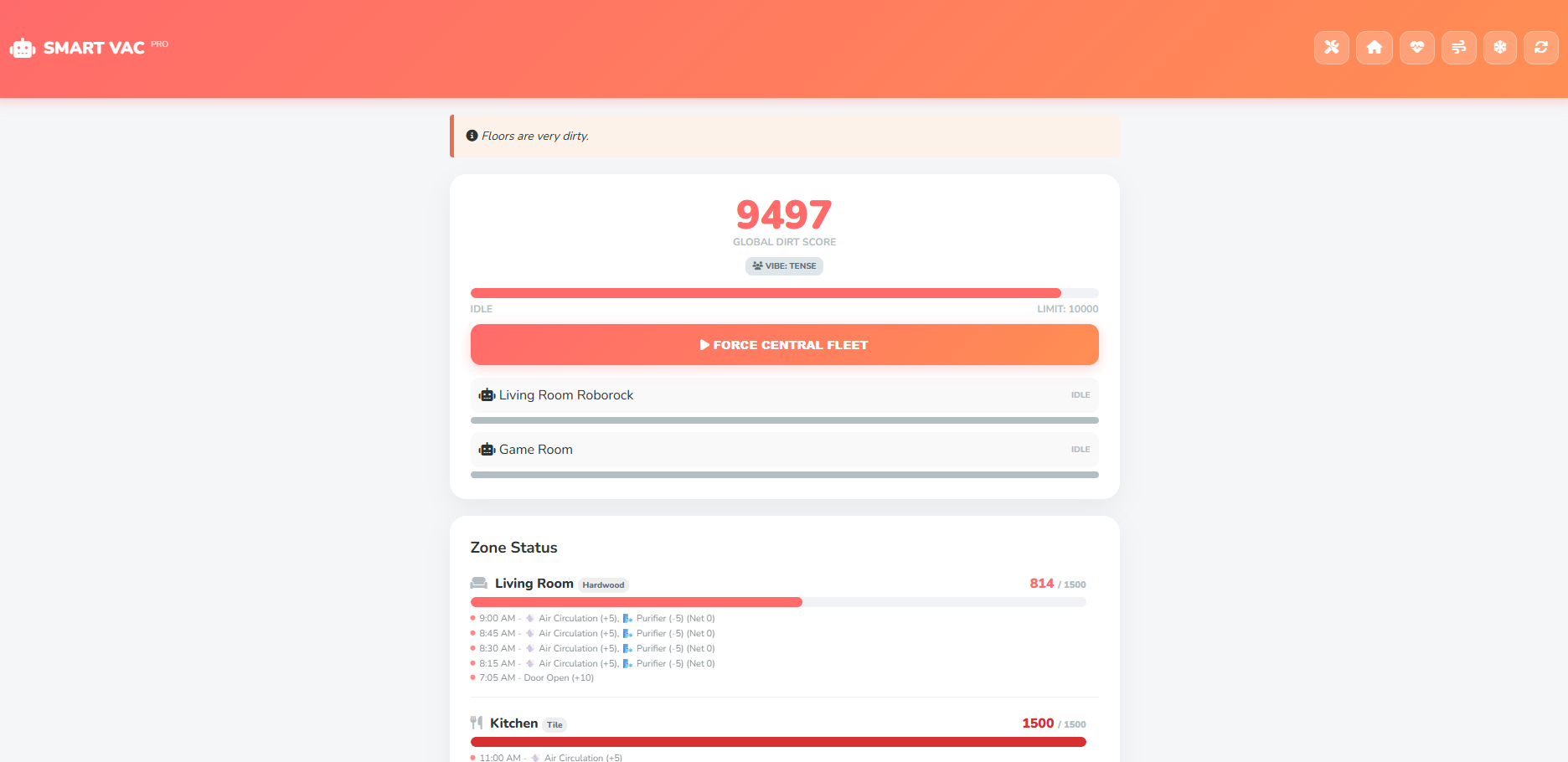 13. Smart Vac Manager Pro: Commercial-grade fleet management. It uses an "Entropy Model" to track dirt accumulation based on pets and foot traffic, only running when the "Dirt Score" is high.