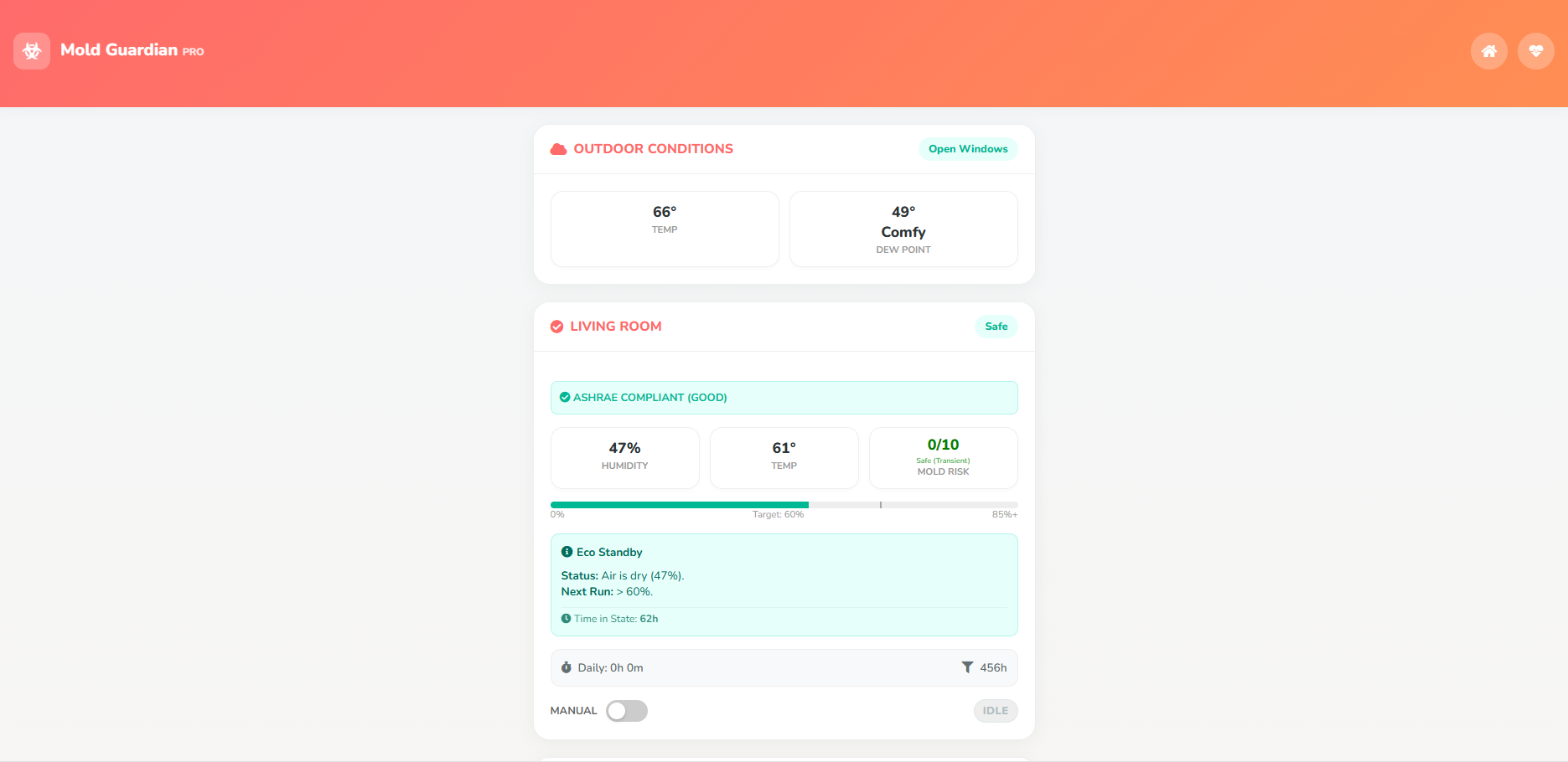 Mold Guardian: Tracks dehumidifier tanks. If a tank becomes full, the tile alerts you, and a popup modal allows you to remote-reset the unit once emptied.