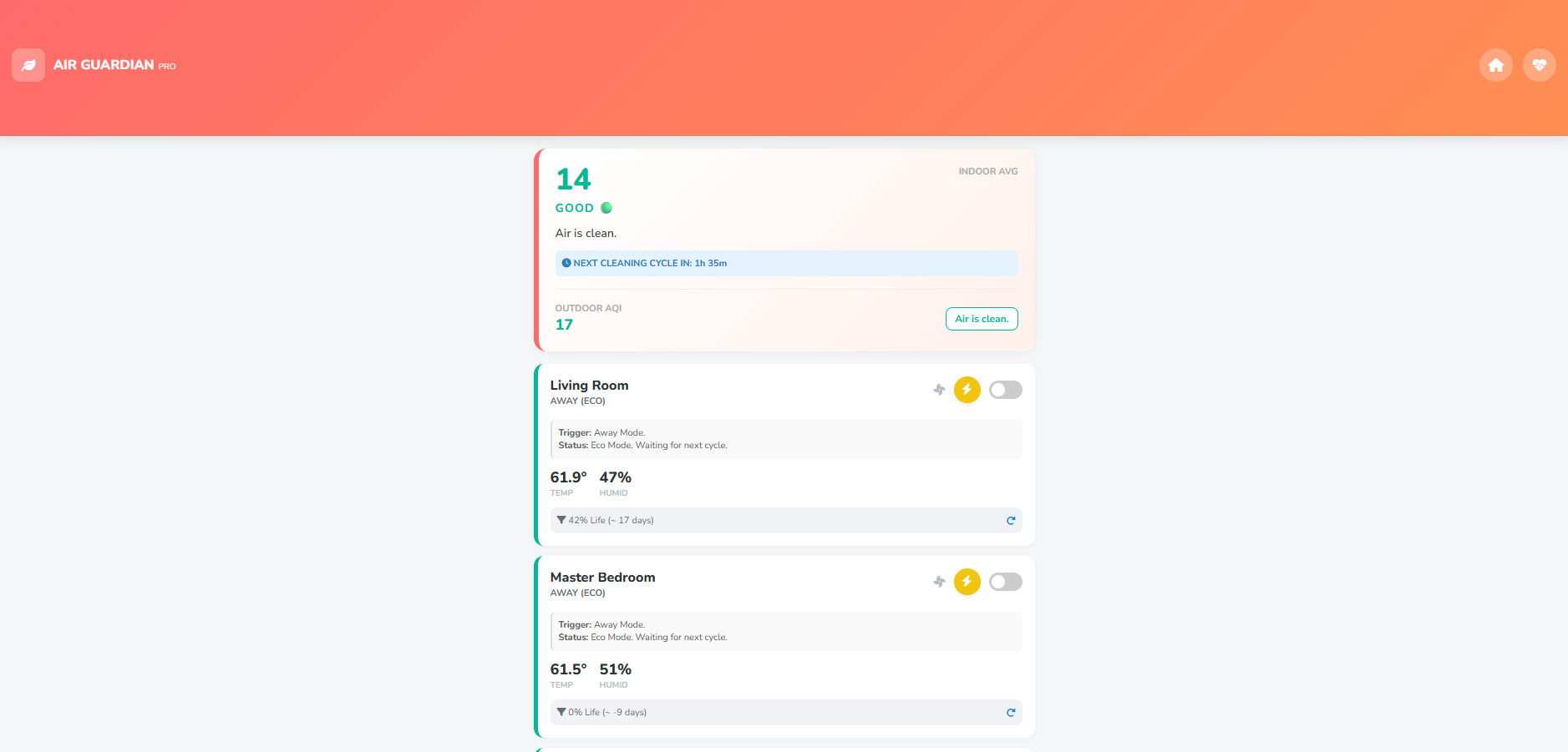 Air Guardian Pro: Monitors air quality and immediately alerts you to critical AQI levels or dirty filters that need replacing.
