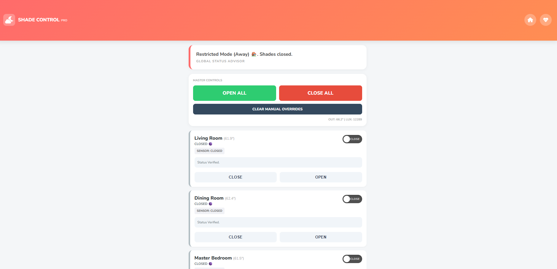 12. Shade Control Pro: Intelligent window management. It uses "TV Logic" to close shades when the television is on to prevent glare, and "Master Fallback" for manual overrides.
