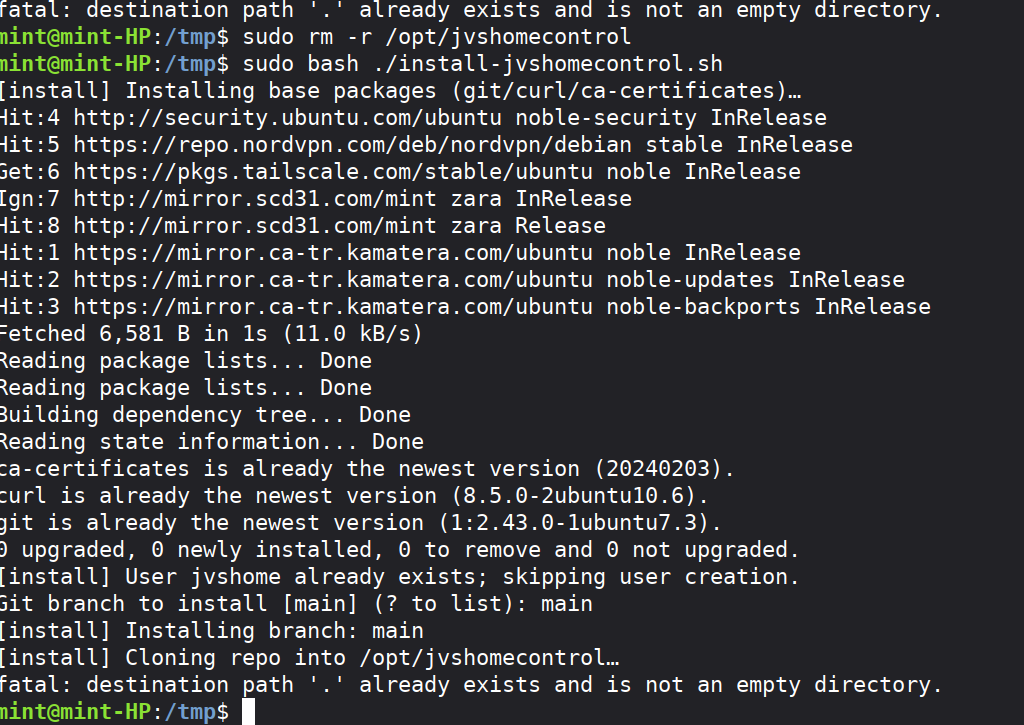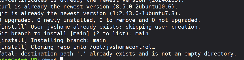 It looks like the /opt/jvshomecontrol dir was populated with something but not the .git file so git refuses to clone into it. just sudo rm -r /opt/jvshomecontrol then run the installer again.