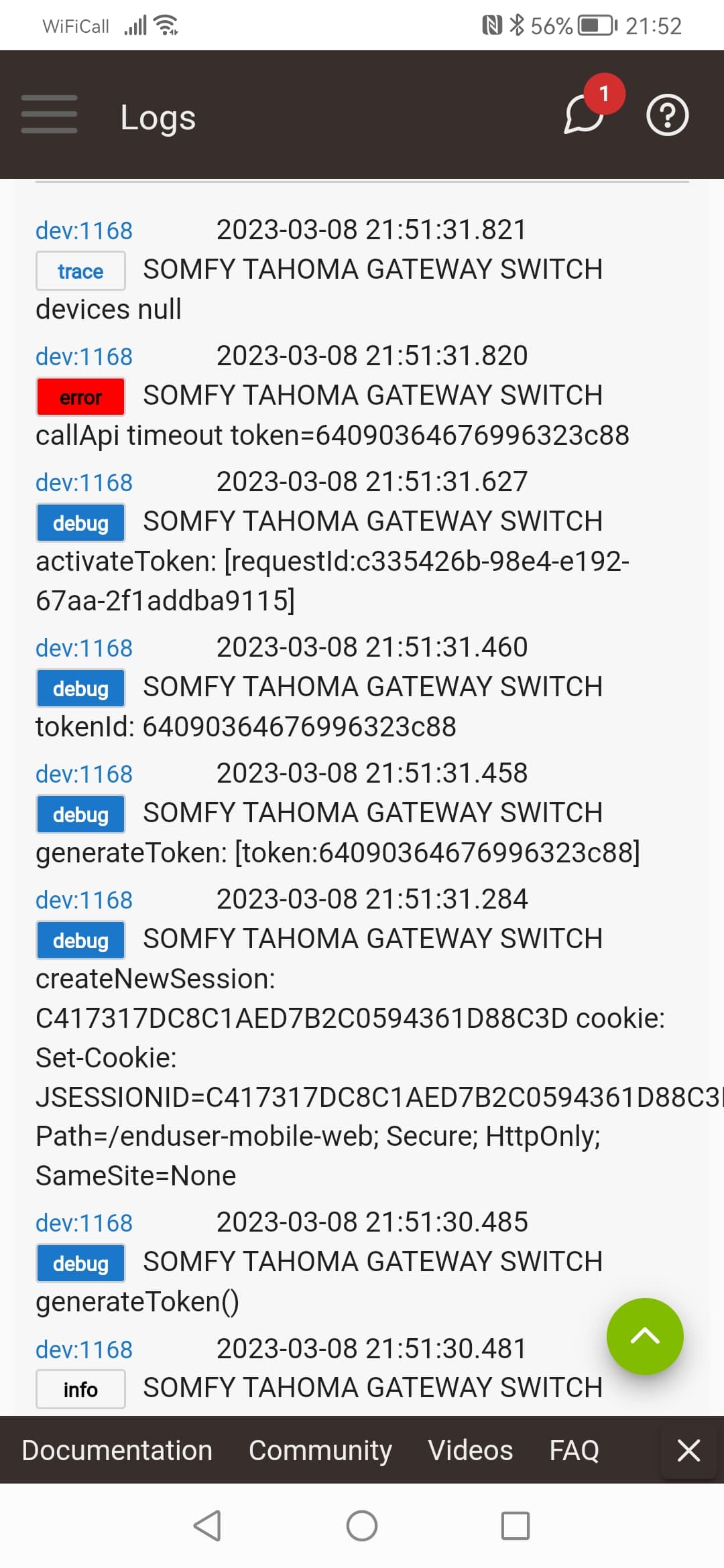 dev:11682023-03-08 21:10:45.964infoSOMFY TAHOMA GATEWAY SWITCH TaHoma Switch token will be refreshed