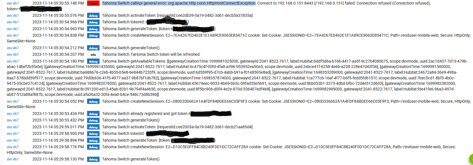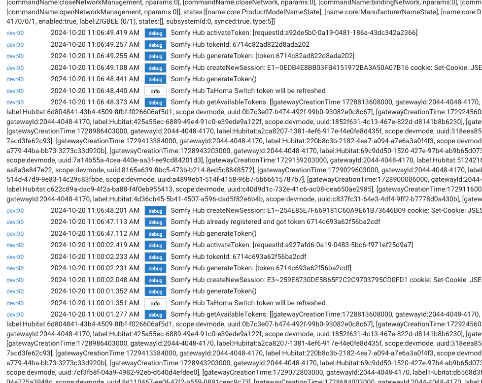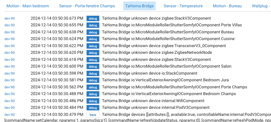 TaHoma Bridge devices [[attributes:, available:true, controllableName:internal:PodV3Component, definition:[attributes:, commands:[[commandName:setLightingLedPodMode, nparams:1, paramsSig:p1], [commandName:deactivateCalendar, nparams:0], [commandName:activateCalendar, nparams:0], [commandName:setCalendar, nparams:1, paramsSig:p1], [commandName:refreshUpdateStatus, nparams:0], [commandName:refreshPodMode, nparams:0], [commandName:getName, nparams:0], [commandName:update, nparams:0], [commandName:setPodLedOff, nparams:0], [commandName:setPodLedOn, nparams:0], [commandName:setCountryCode, nparams:1, paramsSig:p1]], states:[[name:core:LocalIPv4AddressState], [name:core:LocalAccessProofState], [name:internal:Button2State], [name:internal:Button1State], [name:core:ConnectivityState], [name:core:CountryCodeState], [name:core:NameState], [name:internal:LightingLedPodModeState], [name:internal:Button3State]], type:ACTUATOR, uiClass:Pod, widgetName:Pod], deviceURL:internal://2044-4048-4170/pod/0, enabled:true, label:Somfy Hub, states:[[name:core:CountryCodeState, type:3, value:FR], [name:internal:LightingLedPodModeState, type:1, value:1], [name:core:NameState, type:3, value:Box], [name:core:ConnectivityState, type:3, value:online], [name:core:LocalIPv4AddressState, type:3, value:192.168.1.215]], subsystemId:0, synced:true, type:1], [attributes:, available:true, controllableName:internal:WifiComponent, definition:[attributes:, commands:[[commandName:setTargetInfraConfig, nparams:2, paramsSig:p1,p2], [commandName:setWifiMode, nparams:1, paramsSig:p1], [commandName:clearCredentials, nparams:0]], states:[[name:internal:WifiModeState], [name:internal:CurrentInfraConfigState], [name:internal:SignalStrengthState]], type:ACTUATOR, uiClass:Wifi, widgetName:Wifi], deviceURL:internal://2044-4048-4170/wifi/0, enabled:true, label:INTERNAL (wifi/0), states: