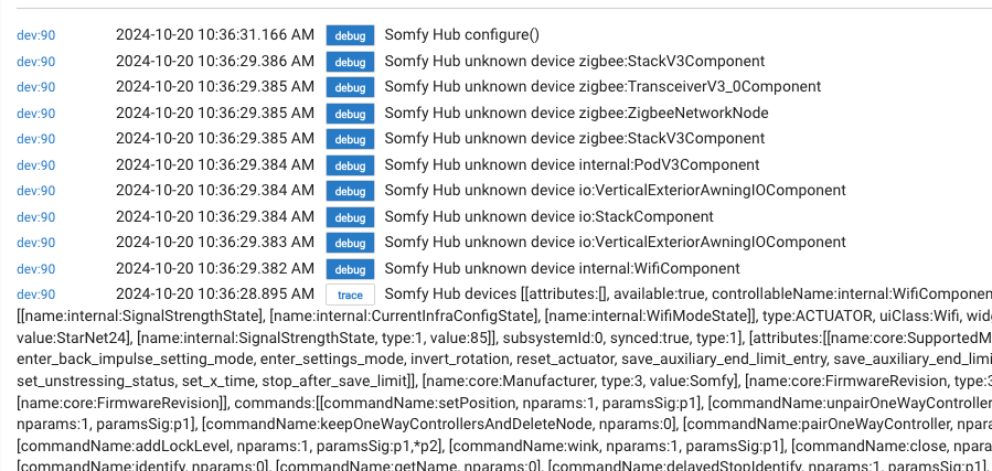 A text based version of the log would be useful that starts with "[trace] Somfy Hub devices [[attributes...".