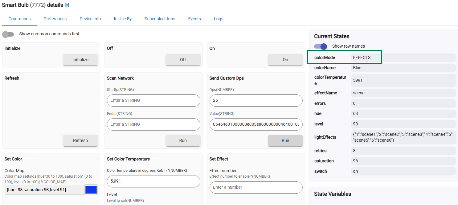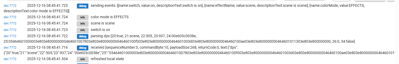 The moded driver needs some more work to hardcode the default Tuya scenes / light effects - these are also working, when copying the code manually from the Refresh() command debug logs :