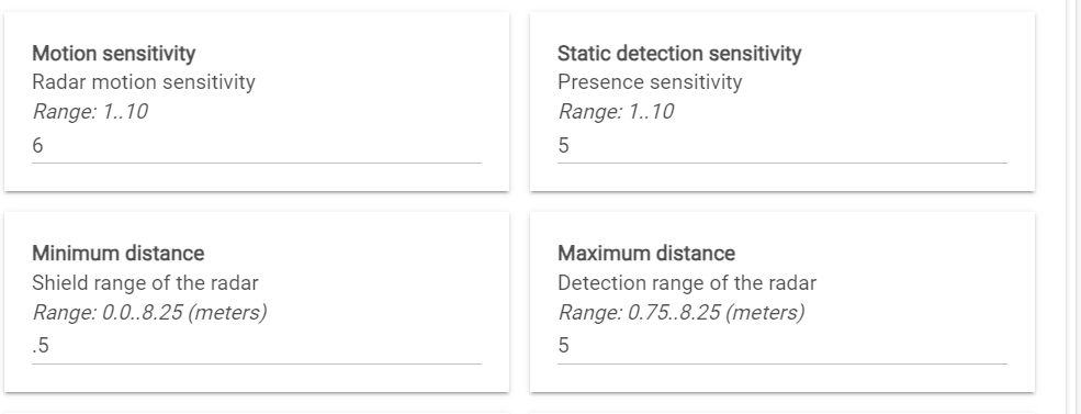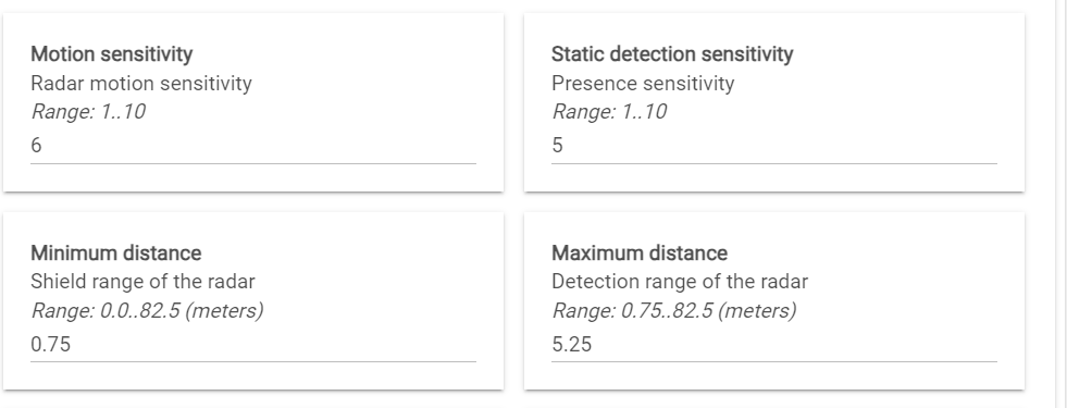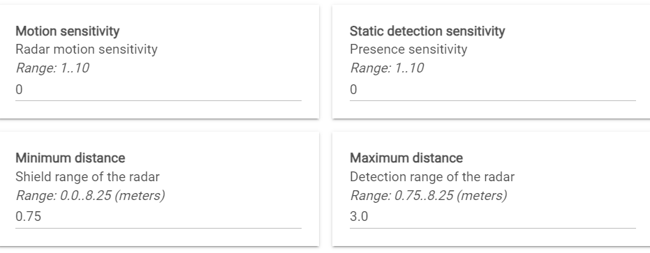 Without the ability to adjust these key parameters, it’s difficult to assess the full performance of the device or confirm whether it’s working as designed. While the default/factory settings may work for many situations, the lack of flexibility in fine-tuning makes it harder to optimize the device for my specific use case. Additionally, is zero the default for these parameters, given how they impact the triggering of the “humanMotionState”?