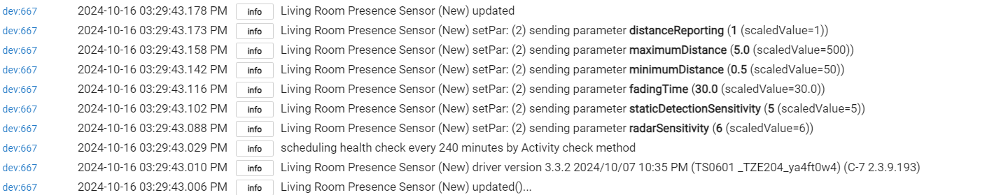 dev:6672024-10-16 03:34:51.649 PMinfoLiving Room Presence Sensor (New) setPar: (2) sending parameter radarSensitivity (6 (scaledValue=6))