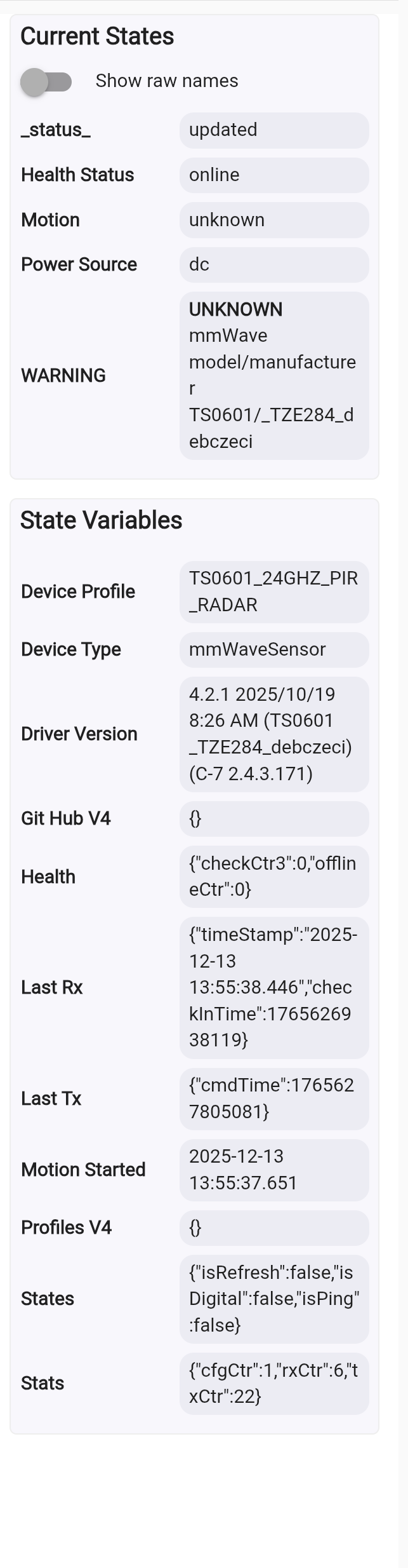 I removed the device, started fresh, and paired it again. Hubitat didn’t find a matching driver, so it went straight to the generic “Device” driver — the one that lovingly wipes Current States and State Variables clean. I then switched it over to the Human Presence Sensor driver, paired (and paired it again just for fun ) as you suggested… still no luck.