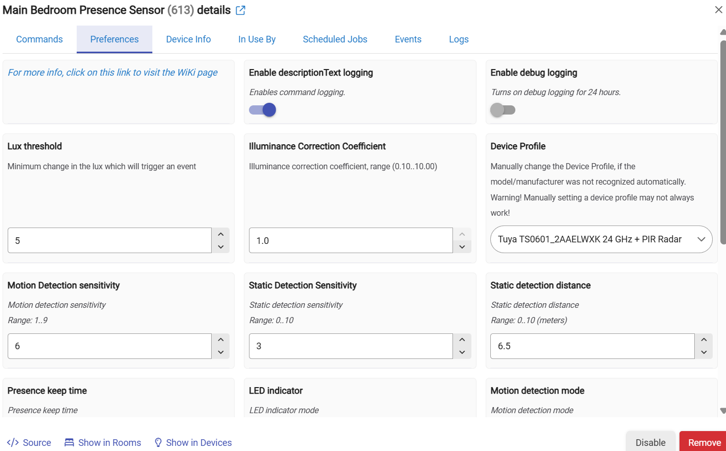 But even after re-pairing, the Preferences section is still basically devoid of options. That may simply be the full extent of what the stock driver exposes — just a slim set of attributes to work with. It is reporting motion, battery, and illuminance reliably, which is good, but I was certainly hoping for a bit more to adjust and more attributes to use in Webcore.