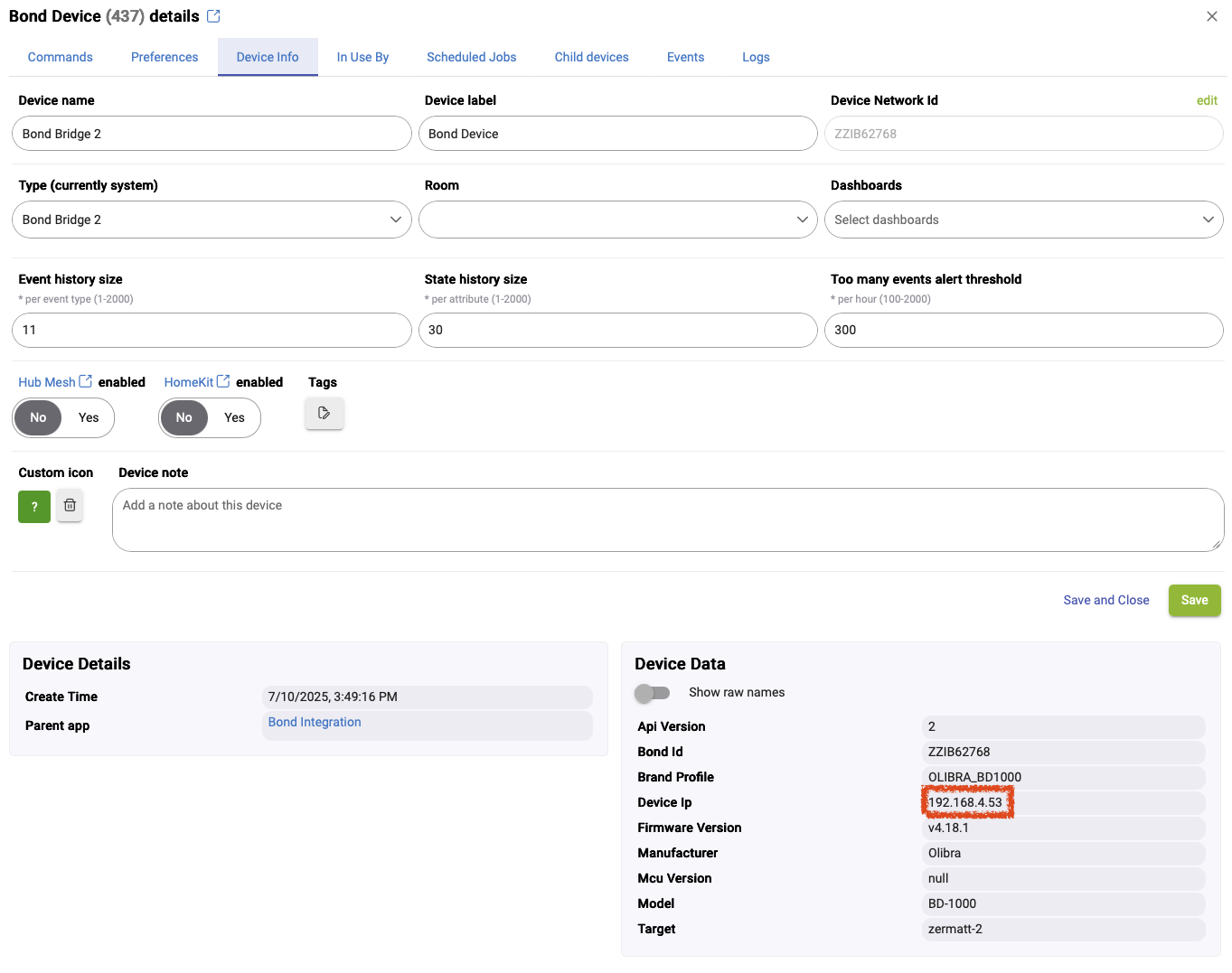 The Bond Bridge (192.168.4.53) is in the same subnet as Hubitat (192.168.4.51) and both have reserved IPs.