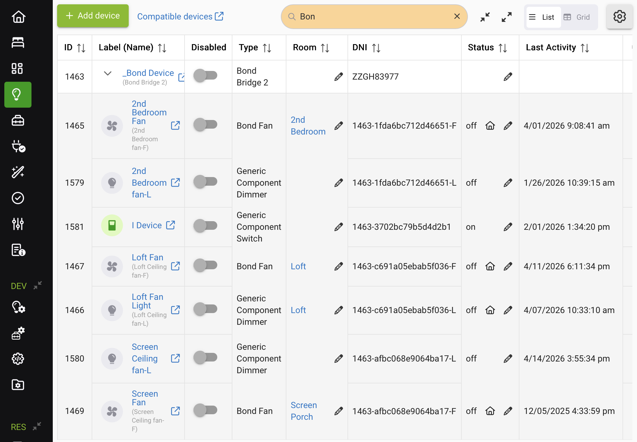 Bond bridge has 2 identical fans on it. They do not show up under devices. If I open the Bond device and then select a child device for one of the fans, then both fans will now show up when I hit the device list. If I hit the device list again, both fans are gone. Is this how it it supposed to work? I would think the child devices would always show up under the device list.