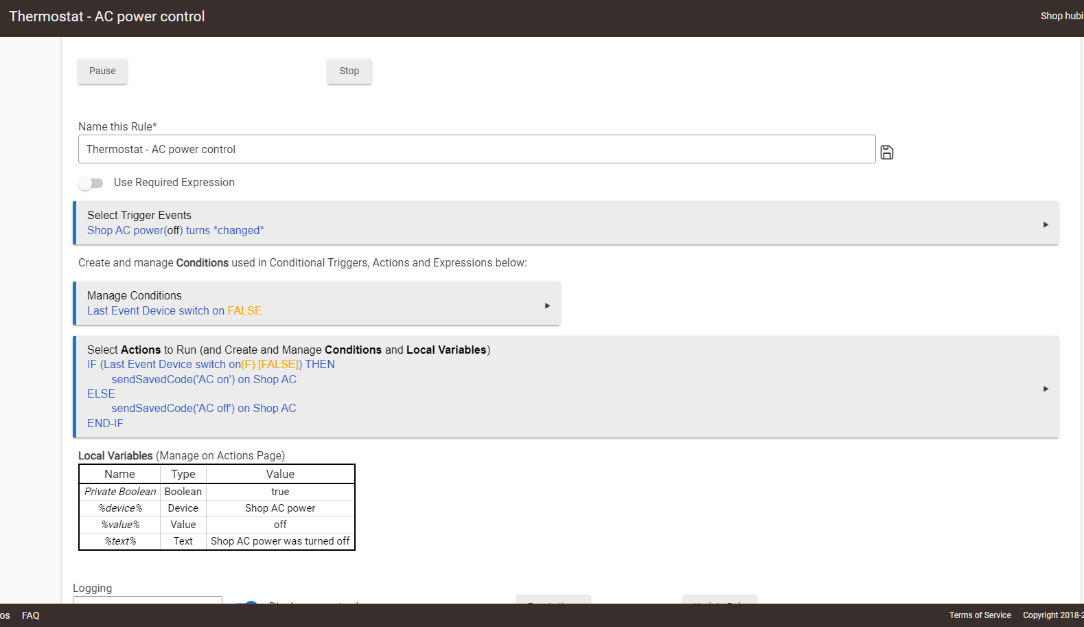 I use the BL to control an old Delonghi unit in the office of my shop. All I can do is turn it on and off. I created a virtual power switch and when that switch is turned on and off it calls the codes I learned and saved. Shop AC is the BL remote device, Shop AC Power is the virtual switch. I use a virtual thermostat to monitor the temp and turn the switch on and off when AC is needed.