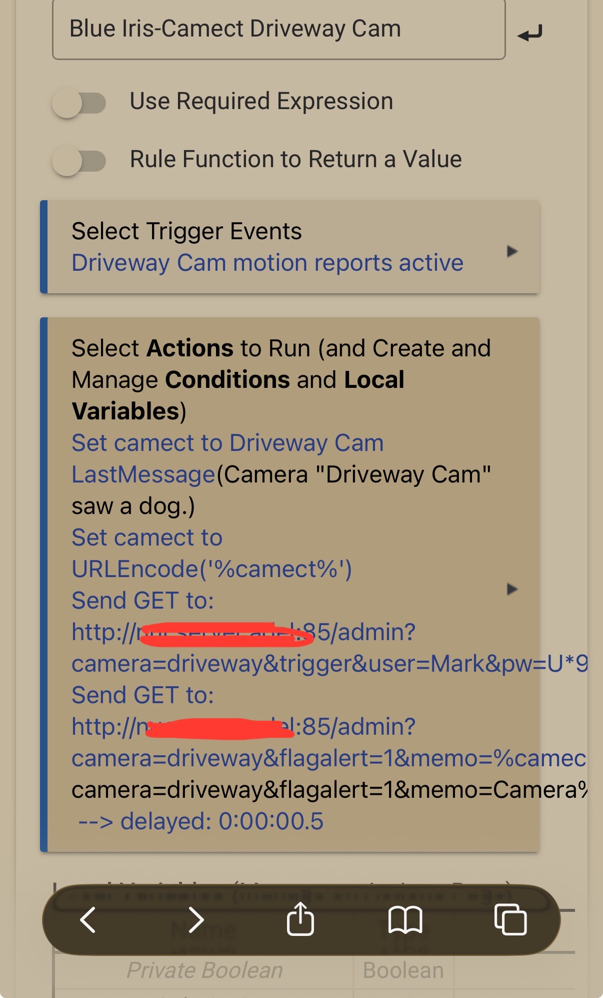 The rule sets a local variable to a device attribute, then URL encodes the variable, and sends an http get with the URL encoded output.