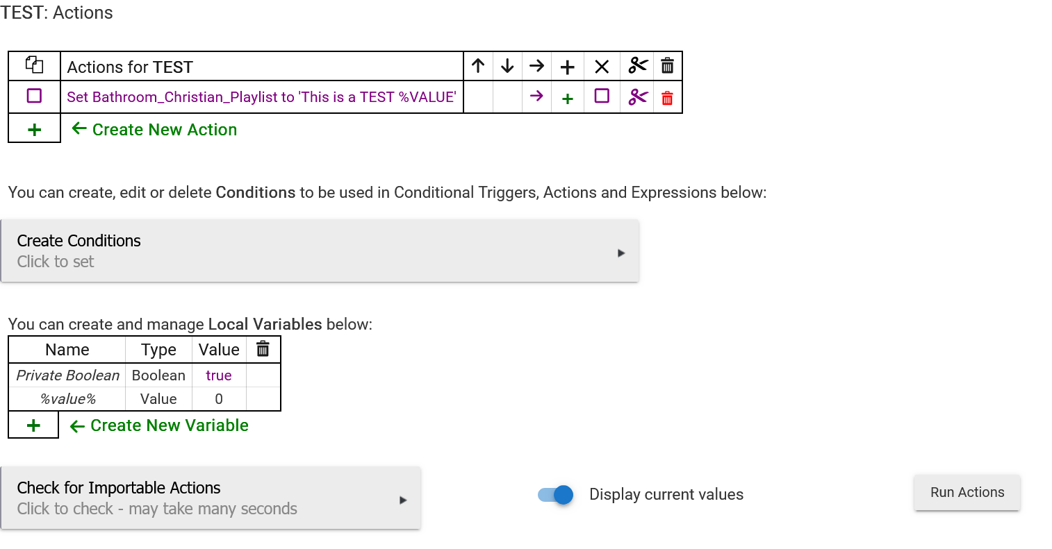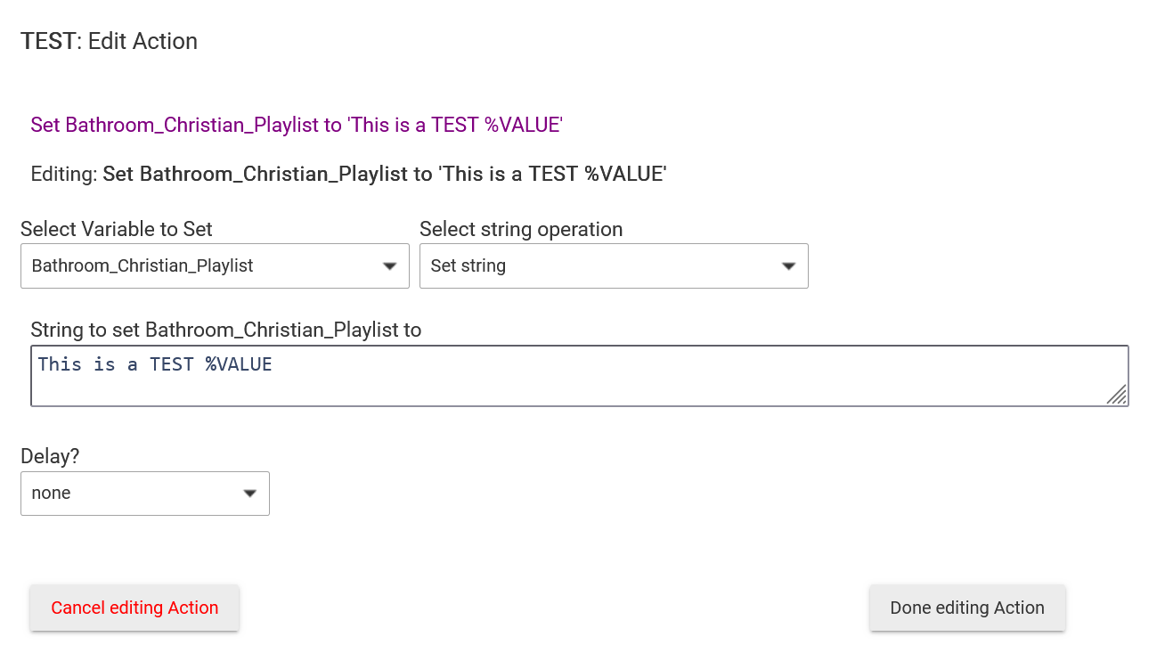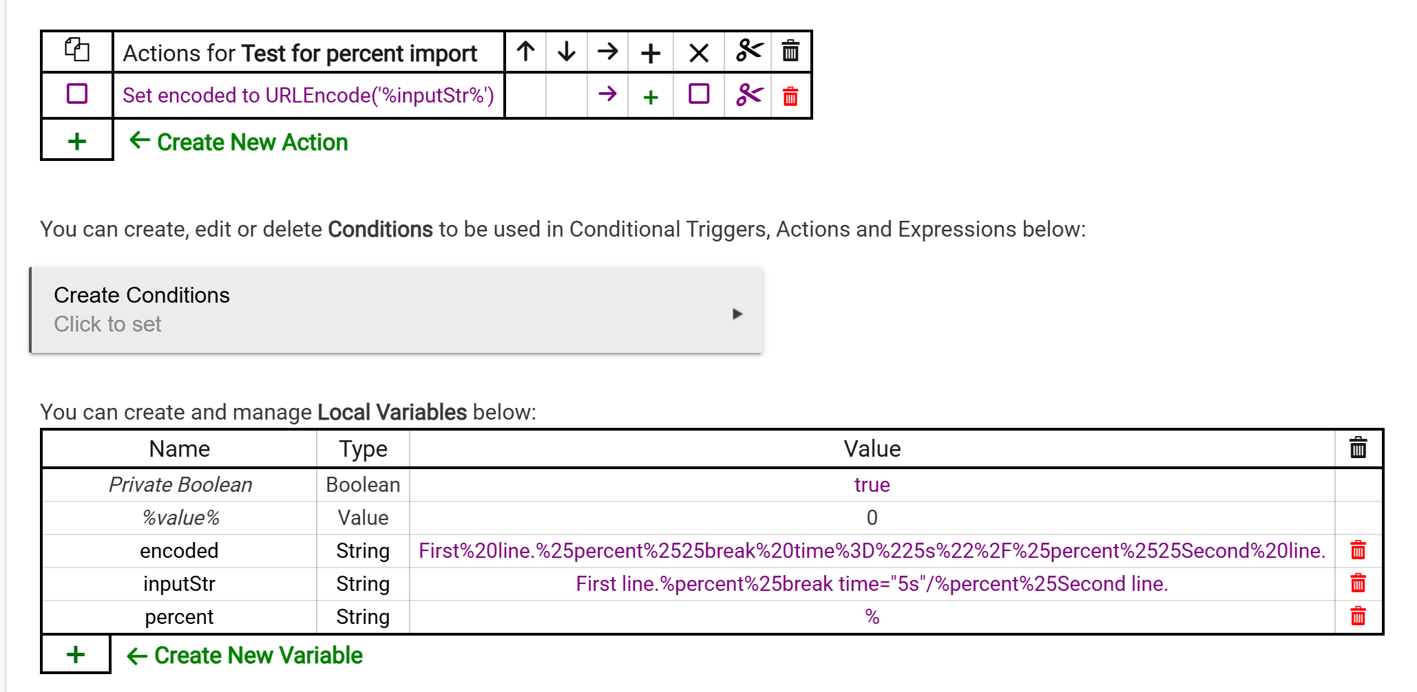 "First line.angle bracketbreak time="5s"/angle bracketSecond line." Oh joy I can't even post the exact string. The first sign things are not going to go well was when Rule Machine politly stripped away the contents between the angle brackes. So I couldn't construct the string I wanted to post. Thinking I could outsmart this I thought I would encode the brackets myself, like this: "First line.%25break time="5s"/%25Second line." And there it is, instead of the desired test I reference a variable called "25break time="5s"/".
